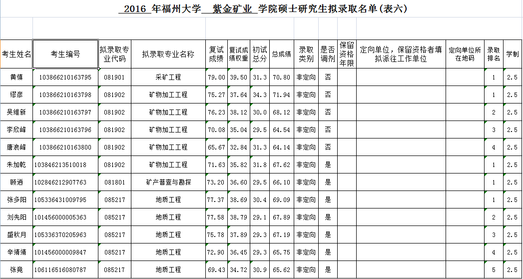 紫金矿业学院2016年硕士研究生第一轮拟录取名单公示
