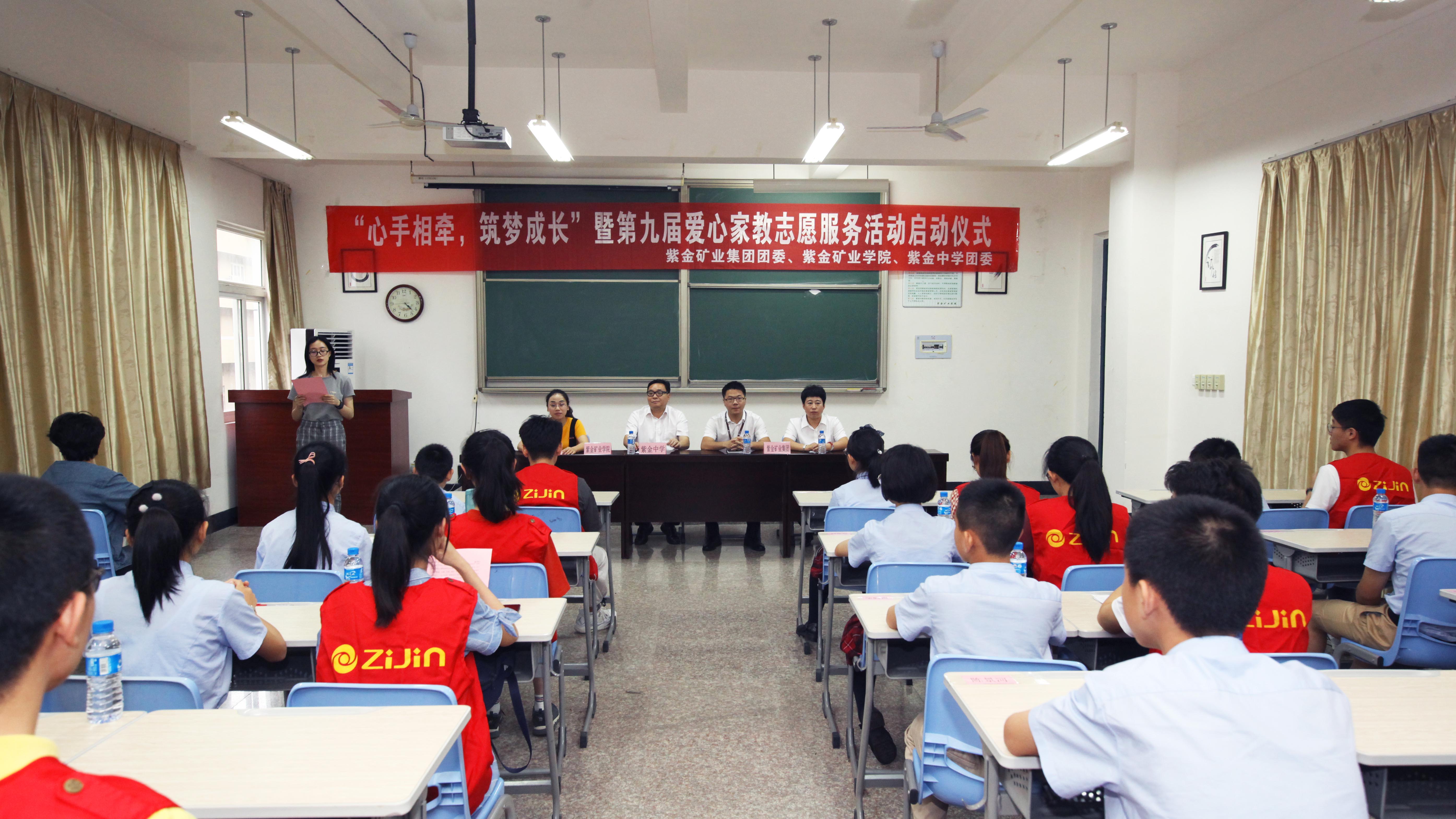 为大力弘扬雷锋精神,响应共青团“奉献、友爱、互助、进步”的志愿服务号召,鼓励广大青少年向上向善,积极为社会提供志愿服务, 5月20日下午,由紫金矿业集团团委、成人影视 紫金矿业学院、紫金中学团委联合举办的“心手相牵,筑梦成长”暨第九届爱心家教志愿者活动启动仪式在上杭教学基地综合楼201举行。出席本次活动的有紫金中学副校长林裕良,紫金集团团委书记赖吉辉,成人影视 紫金矿业学院教师姜秀玲,紫金中学团委书记胡艳霞,同时来到启动仪式现场的还有紫金中学的同学和紫金矿业学院2016级的志愿者们。