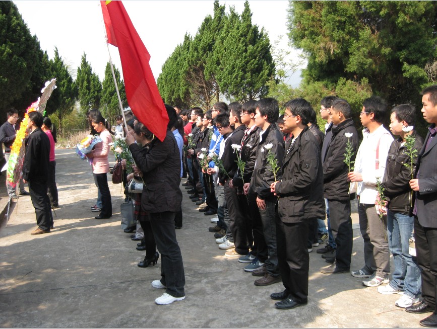 2011年4月2日成人影视2008级学生党支部全体学生党员、发展对象、入党积极分子到上杭县烈士陵园举行了清明节祭奠烈士活动。参加祭扫活动的还有团县委党员代表、上杭教学基地在住教师。上午7:50,参加祭奠烈士活动的师生在基地门口集合,8:00准时出发,步行到达烈士陵园。首先,韩雪同志负责主持扫墓仪式,大家排着整齐的队伍来到烈士的墓碑前,全体人员肃立,向革命先烈们默哀。接着,陈璐同志为我们宣读烈士们的英勇事迹,并带领全体人员集体宣誓。随后,大家将自制的小白花献在了烈士纪念碑前,来缅怀革命先烈。最后,大家一起参观革命烈士纪念碑,每个人的心情都很沉重,感到我们如今的生活来之不易,使得我们更加懂得珍惜生活,热爱祖国。本次活动培养了同学们的爱国情怀,使大家在继承先烈革命传统,发扬前辈爱国精神的同时,更加珍惜现在的幸福生活。我们要心系祖国,把国家命运放在第一位,努力学习科学文化知识,立志为中华民族的伟大复兴而奋勇拼搏。