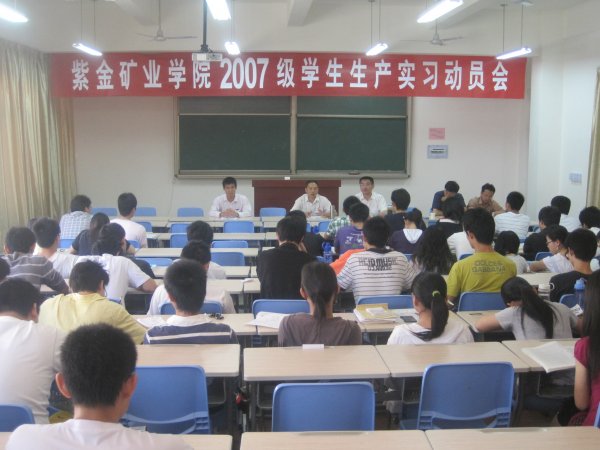 成人影视2007级学生圆满完成在教学基地的专业教学任务,即将前往上杭紫金山金铜矿区、龙岩马坑铁矿等地开展生产实习。为确保学生生产实习的顺利进行,5月24日上午8点30分,在上杭教学基地中东201阶梯教室举行“紫金矿业学院2007级学生生产实习动员会”。参加动员会的有:学院党总支副书记余飞老师、院长助理王少怀老师、采矿教研室的刘建兴老师和胡柳青老师、基地临时党支部书记钟祥华老师和07级全体同学。动员会由钟祥华老师主持。