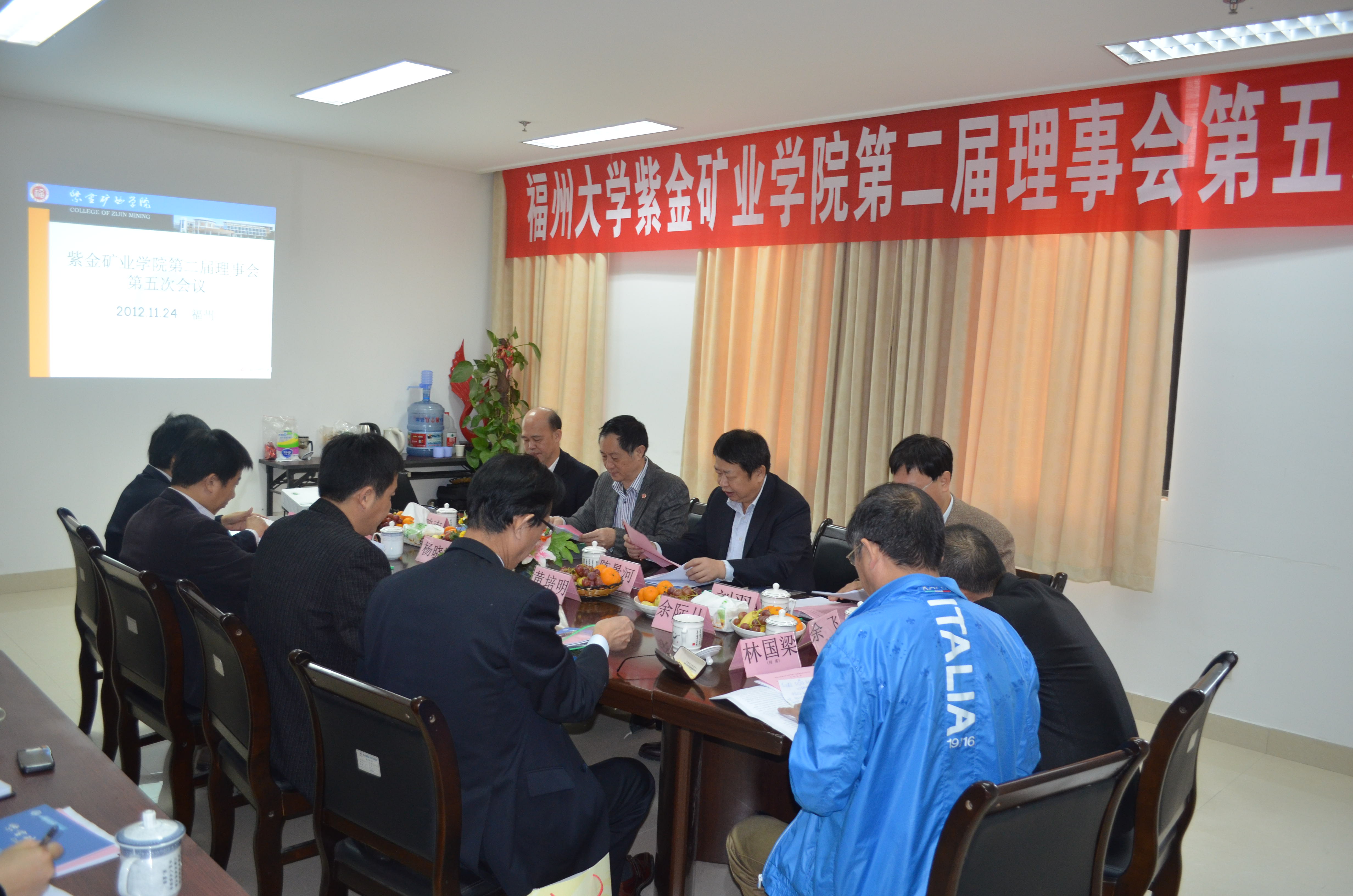 2012年11月24日上午,在陈景河理事长主持下,成人影视 紫金矿业学院第二届理事会第五次会议在成人影视 行政北楼召开。全体理事出席了会议,中国地质学会地质教育分会余际从秘书长一行、学院领导、学院教研室主任和紫金矿业集团总裁办部分人员列席了会议。