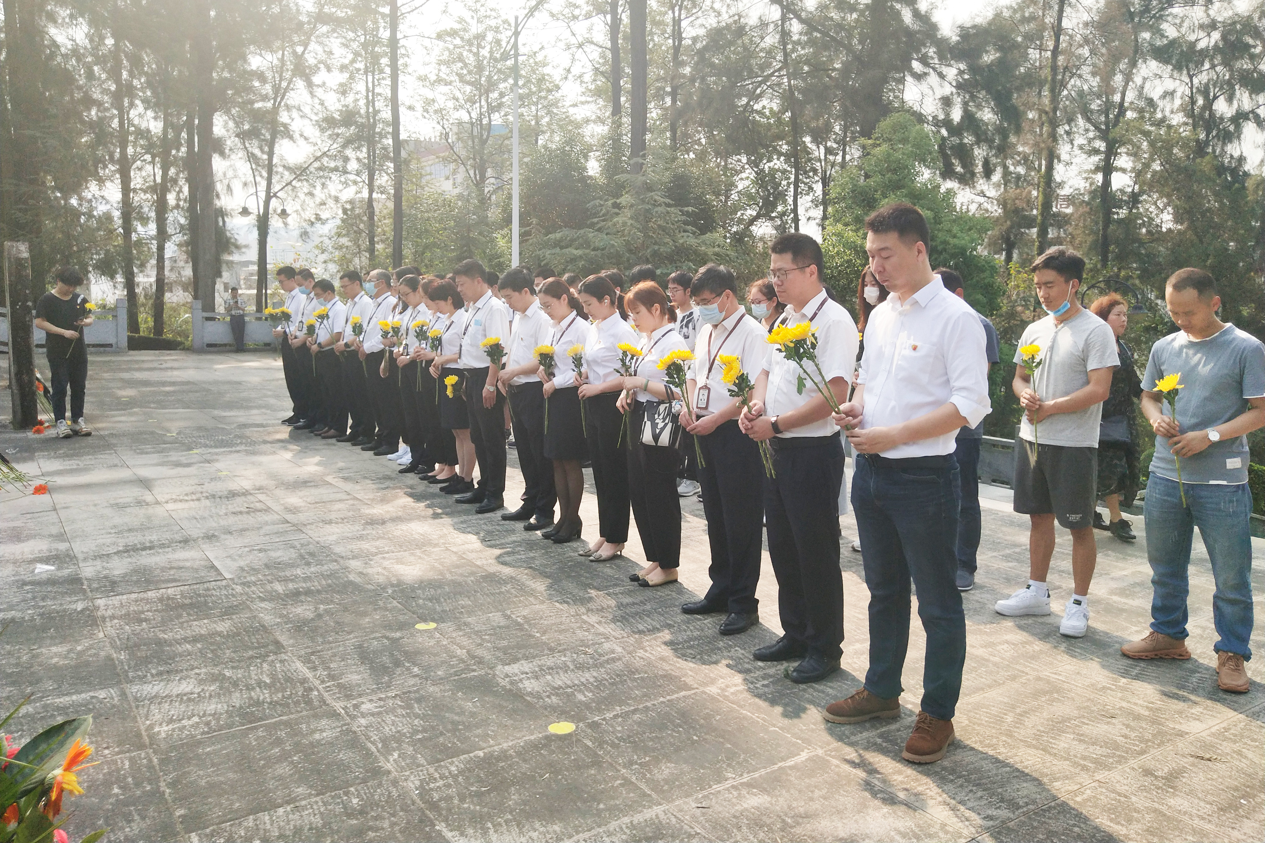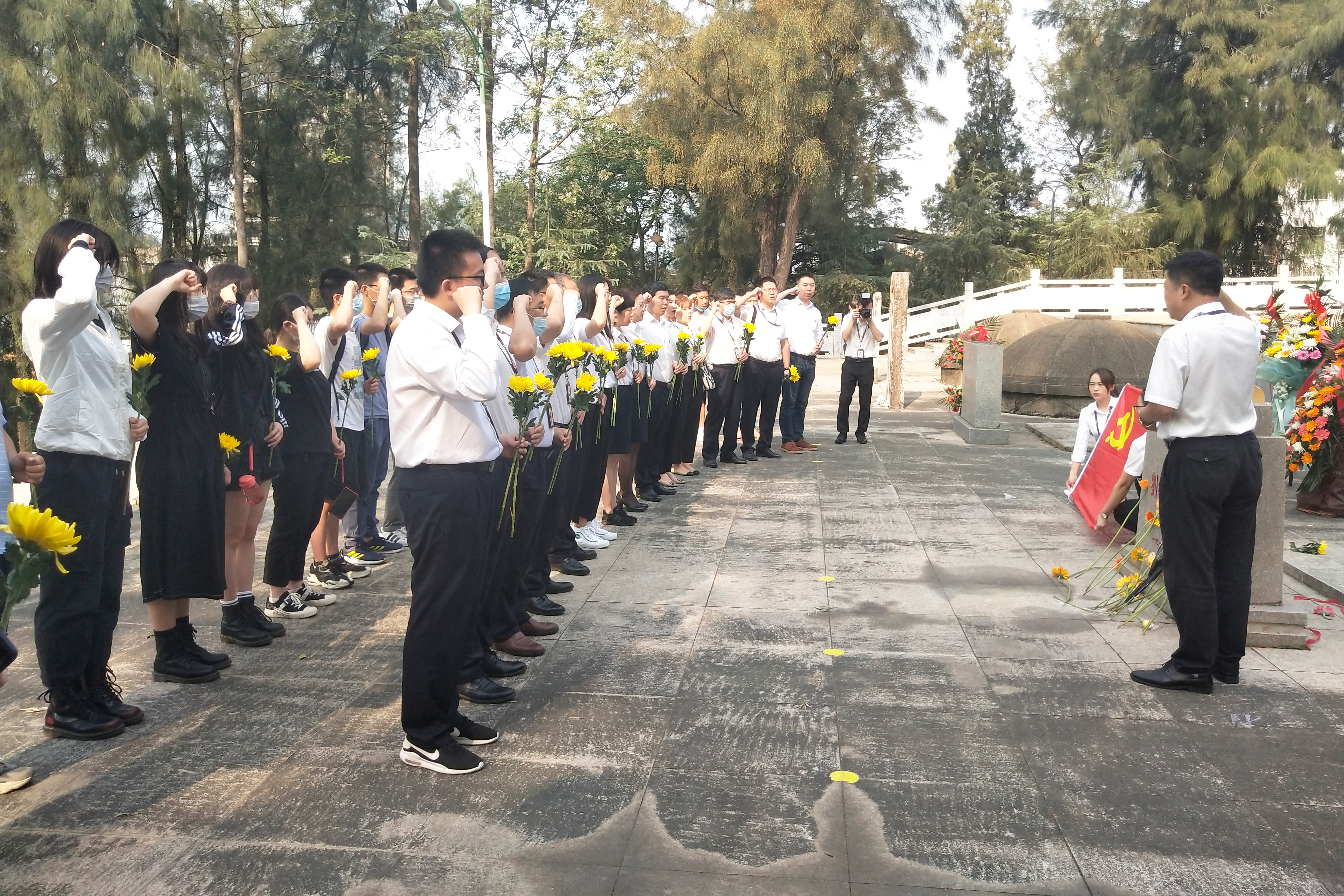 活动伊始,在罗诗涵同学的主持下,全体祭扫人员在革命烈士陵墓前默哀一分钟。默哀结束,集团党群部常务副部长林钦权同志为在场党员上党史学习教育微党课,林副部长讲到:“清明节祭扫活动是为了缅怀革命先烈,继承革命传统,只有缅怀英雄,才能够成为英雄,我们作为新时代的青年党员,更应该坚定理想信念,在学习和工作中发挥党员的先锋模范作用,并且要不断努力,为了建设富强民主文明和谐美丽的社会主义现代化强国而不懈奋斗。”随后,林副部长带领在场全体党员重温入党誓词,用誓词警醒大家要“不忘初心,牢记使命”,要真正体会到自己所肩负的历史使命。最后,全体师生绕行陵园一周,瞻仰烈士墓碑,并向烈士献上菊花,以此寄托对烈士们的哀思与敬意。