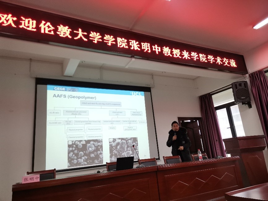 讲座伊始,饶峰老师首先介绍了张明中博士的研究方向和学术成就,印万忠院长对张明中博士的到来表示热烈的欢迎。随后,张明中博士介绍了英国伦敦大学学院(UCL)的发展历史以及学科发展情况,再结合自己在碱激发粉煤灰矿渣(AAFS)的应用研究进行此次报告。