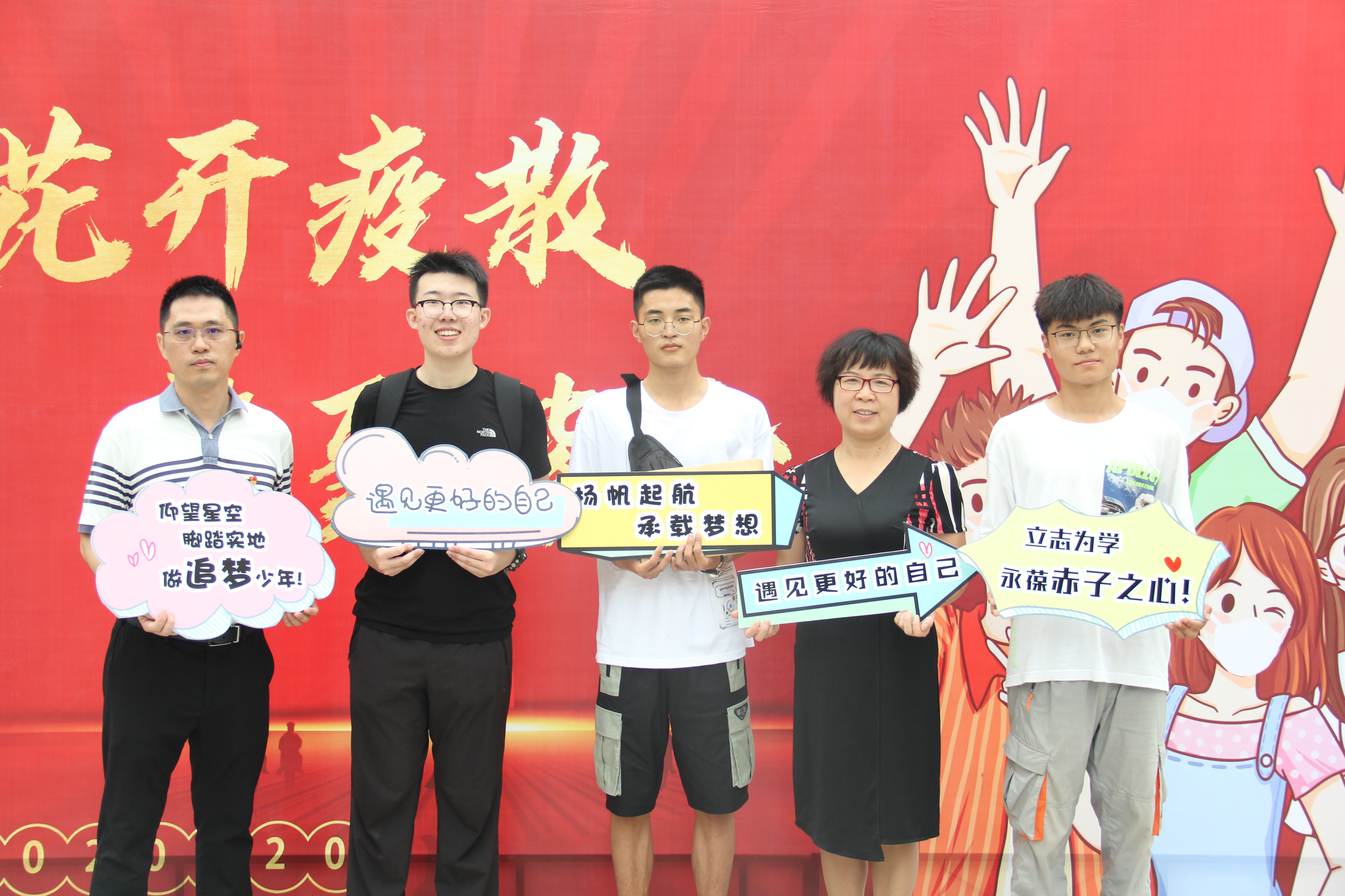 在完成报到注册流程后,老师带领新同学们在“花开疫散,缘聚紫金”的主题背景下,手举写有“遇见更好的自己”、“扬帆起航,承载梦想”等标语的kt板拍照留念,鼓励同学们在进入大学生活后要继续努力,积极向上,争取获得更加辉煌的成绩。