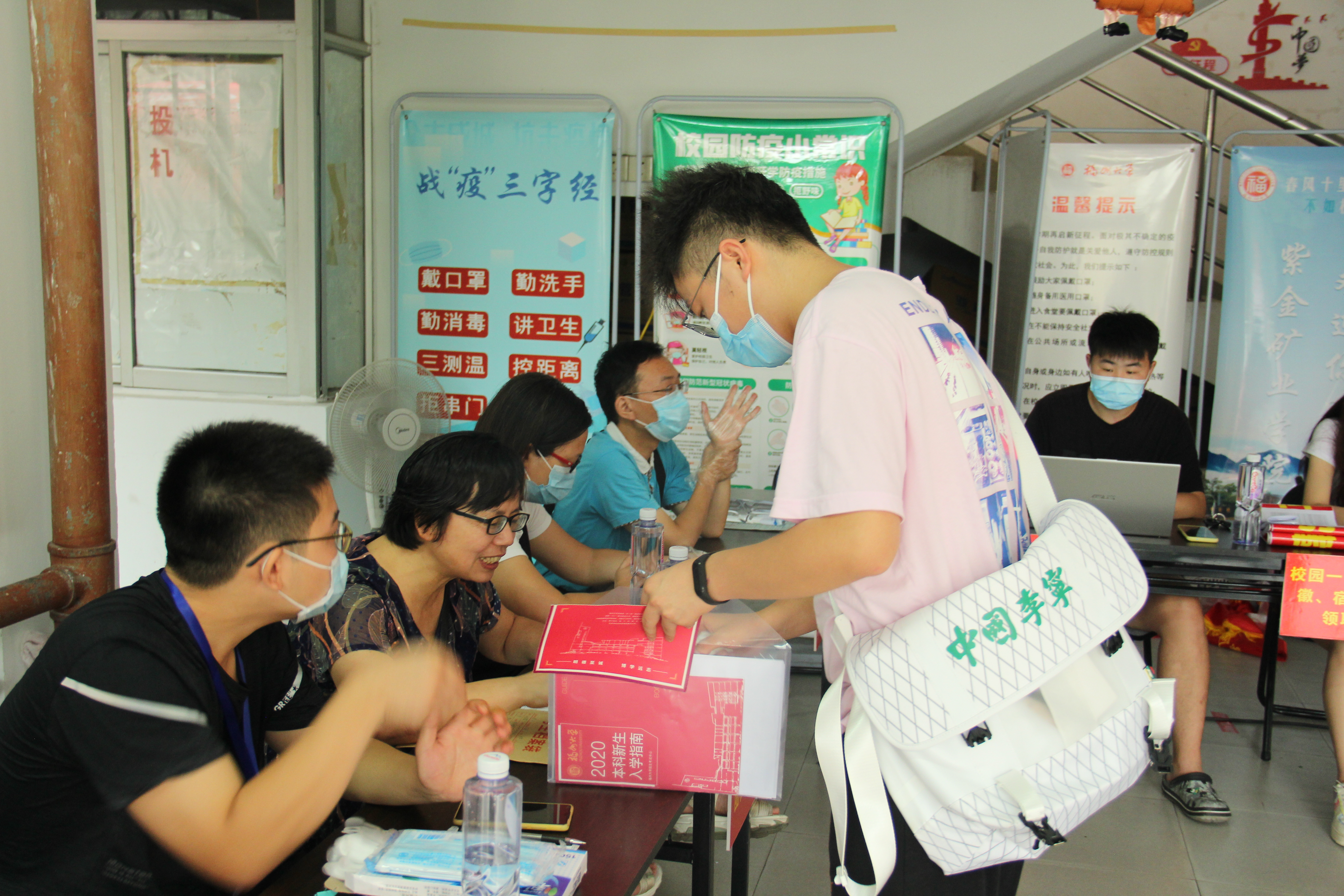 为了让新同学们在入学的第一天就感受到来自学院领导和老师的关怀,迎新工作人员们清晨便精气十足地在宿舍楼下准备了欢迎仪式,热烈欢迎20级新同学的到来。为帮助新同学们尽快找到归属感,迎新人员还精心布置了新生报到处,在宿舍楼下拉起了欢迎新生的拱门,并安排了志愿者帮助新生搬运行李、打扫宿舍。由高年级同学组成的迎新工作组则井然有序地整理新生的录取通知书和报到的相关材料,引导新生正确填报个人信息并做好报到登记。整个报到流程做到了精简化、快速化、准确化,为新生们带来良好的入学体验。学院还为前来报到的新同学们准备了医用口罩、洗手液等防疫用品,并通过扫描绿码进行入学信息登记和健康情况上报,帮助新生们健康报到、健康入学。