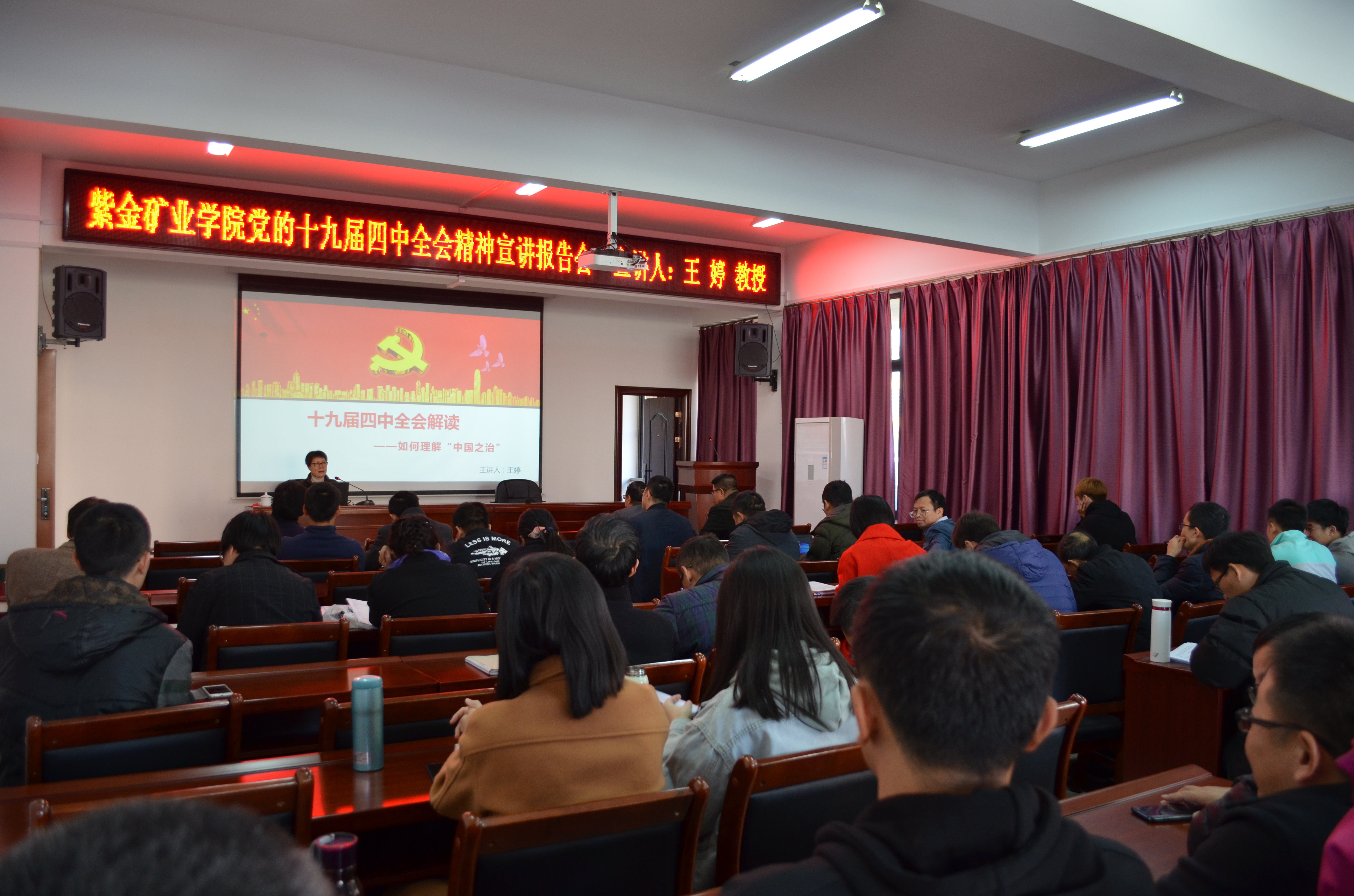 12月12日下午,紫金矿业学院党委在紫金楼304会议室举行学习贯彻党的十九届四中全会精神宣讲报告会——《如何理解“中国之治”》。成人影视 学习贯彻十九届四中全会精神宣讲团成员、经济与管理学院王婷教授作宣讲报告,学院党委副书记郑寿主持报告会。紫金矿业学院全体在家教职工和部分学生代表参加了此次报告会。