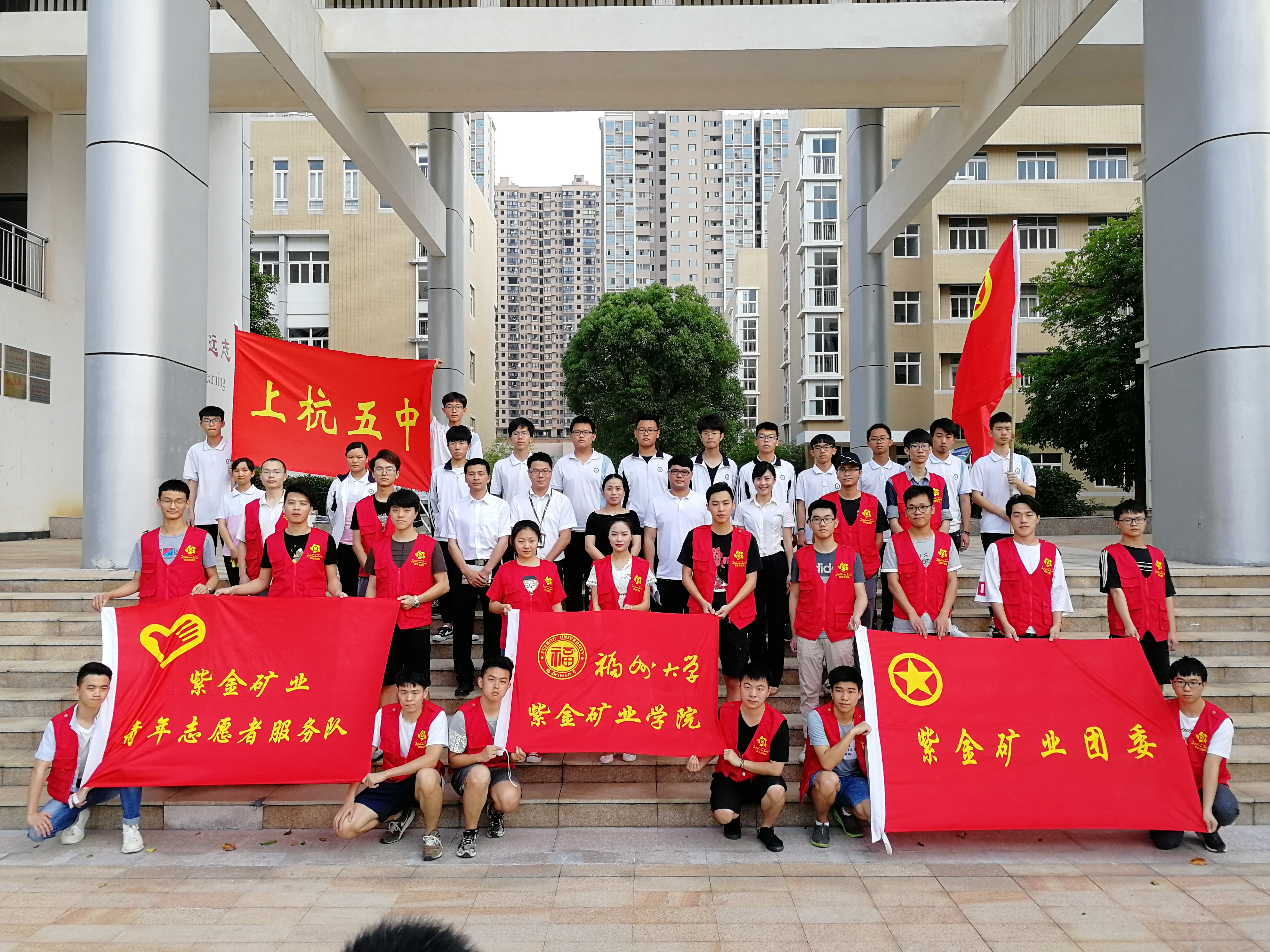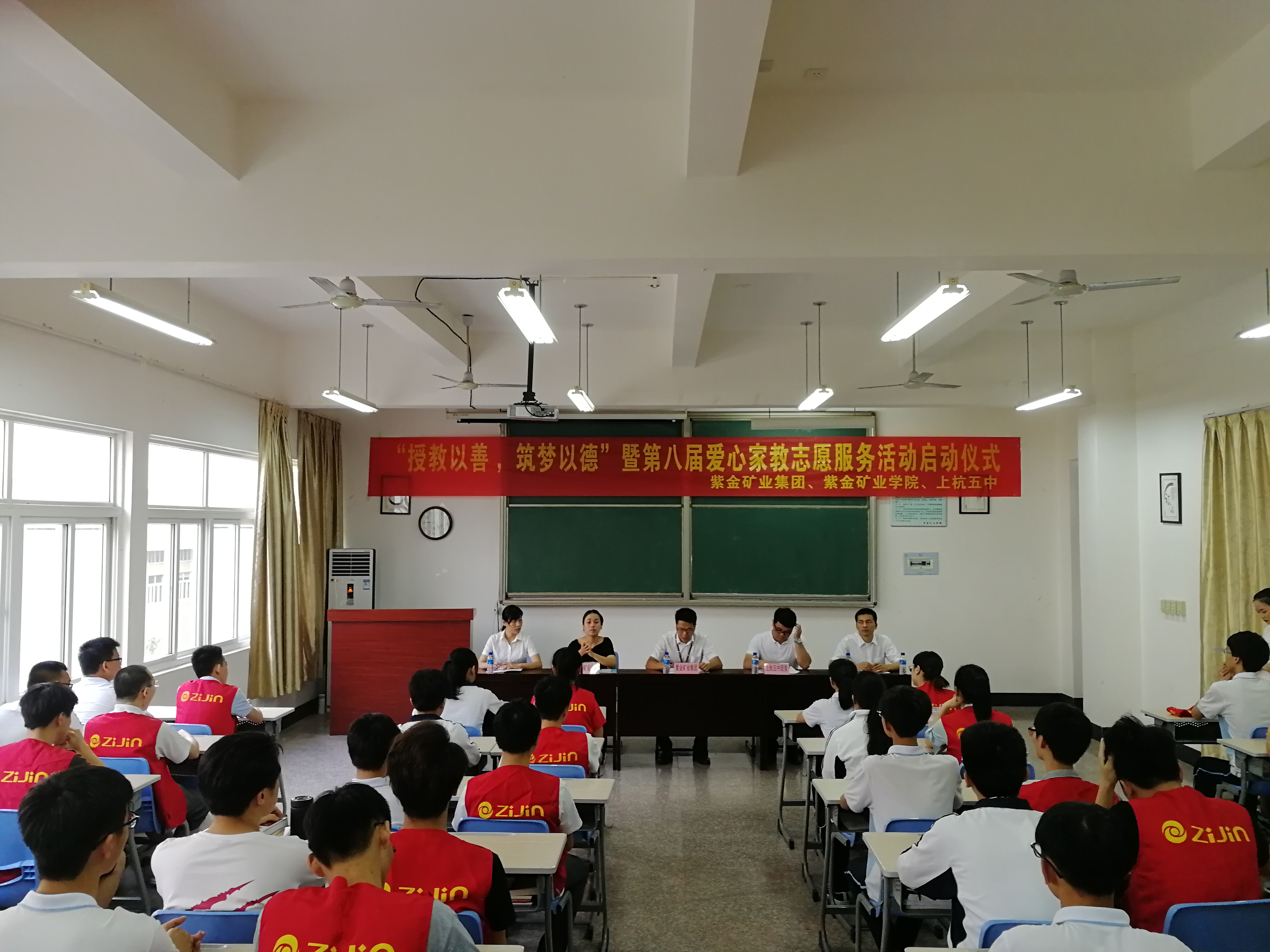 为大力弘扬雷锋精神,响应共青团“奉献、友爱、互助、进步”的志愿服务号召,鼓励广大青少年向上向善,积极为社会提供志愿服务, 5月18日下午,由紫金矿业学院、紫金矿业集团、上杭县第五中学联合举办的“授教以善,筑梦以德”暨第八届爱心家教志愿者活动启动仪式在上杭教学基地综合楼201举行。出席本次活动的有紫金紫金矿业集团团委书记赖吉辉,上杭五中团委书记范道荣,紫金矿业学院2015级辅导员姜秀玲,紫金矿业集团团委副书记、紫金山金铜矿团总支书记阙梦妮,紫金矿业集团团委副书记、紫金山金铜矿团总支书记华建彬,以及紫金矿业学院2015级爱心家教志愿者代表们与上杭五中学生代表们。