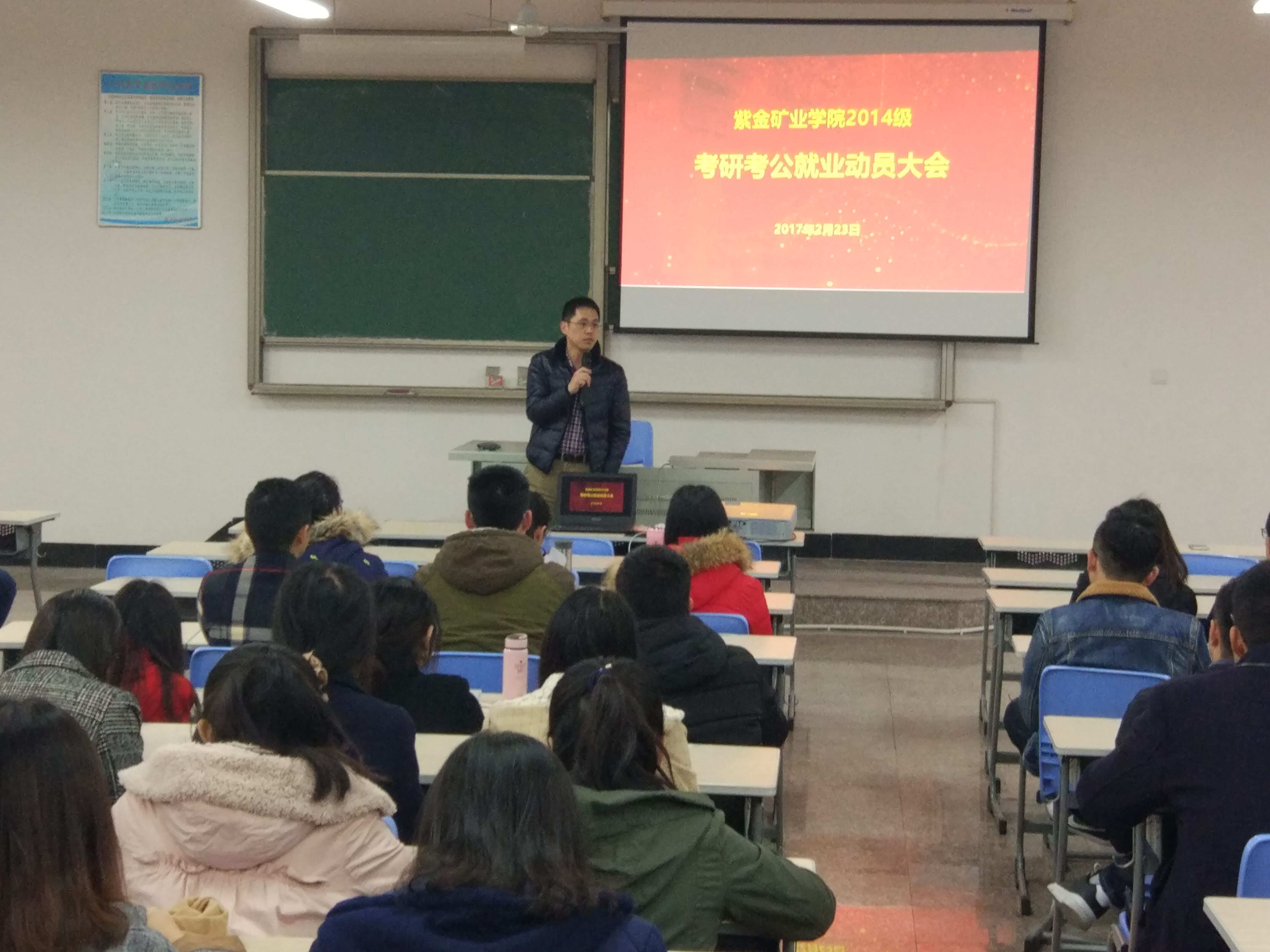2月23日下午,2014级考研考公与就业动员大会在上杭教学基地综合楼501召开,旨在帮助成人影视大三同学及早了解就业形势,明确目标,增强信心。2014级全体同学参加大会,院党委副书记郑寿出席动员大会,大会由辅导员王聪聪主持。