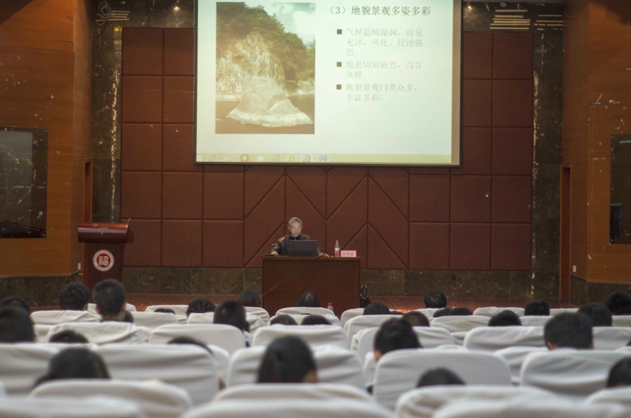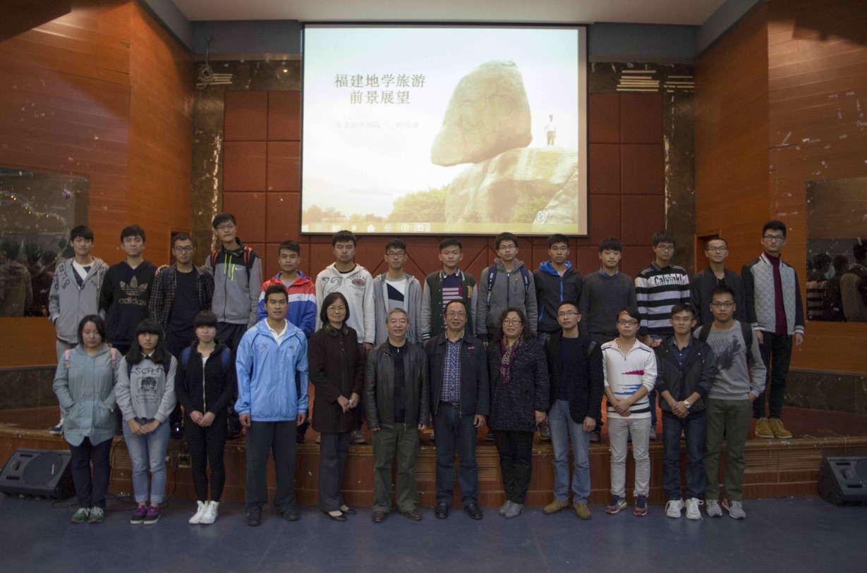 讲座伊始,叶书记先是论述了世界地质旅游的状况,再是转向我国地质公园的建设上,而后则引入到福建省地学旅游的现状。以“世界—中国—福建”为主线,由面及点,层层深入地揭示地学的奥妙。之后,又以福建省几个典型的地学旅游县市为例,讲述了近几年来,地学旅游所取得的显著成效,不但推动了经济发展,使人民生活水平逐步提高;而且优化了产业结构,有力促进了居民的就业和再就业;还起到了提高人民群众旅游品味,普及旅游知识等作用。而本次讲座着重强调了福建省在地学旅游方面有其得天独厚的优势:一、拥有种类齐全的岩石、构造复杂的地理地质、多姿多彩的地貌景观。二、具有发展地学旅游的客观物质基础。三、符合国家发展的战略政策。四、对自然地质具有保护效益。五、促进两岸合作交流。