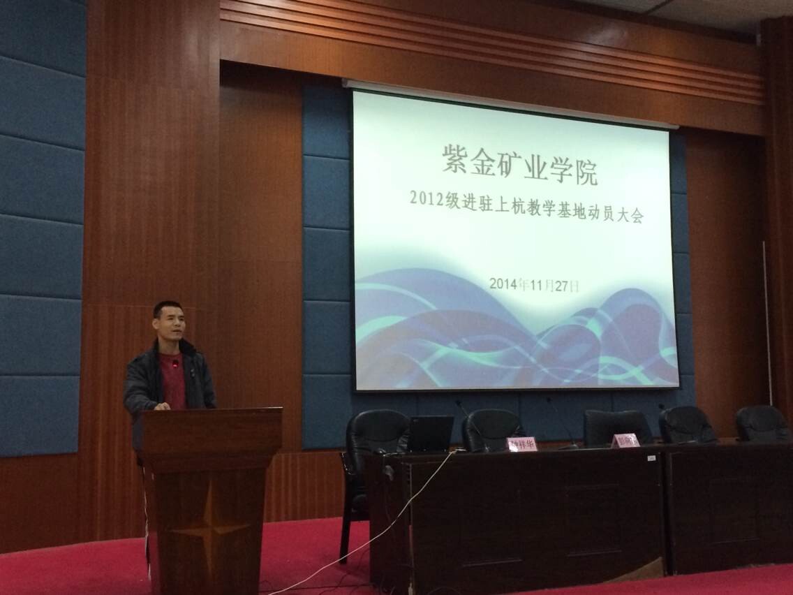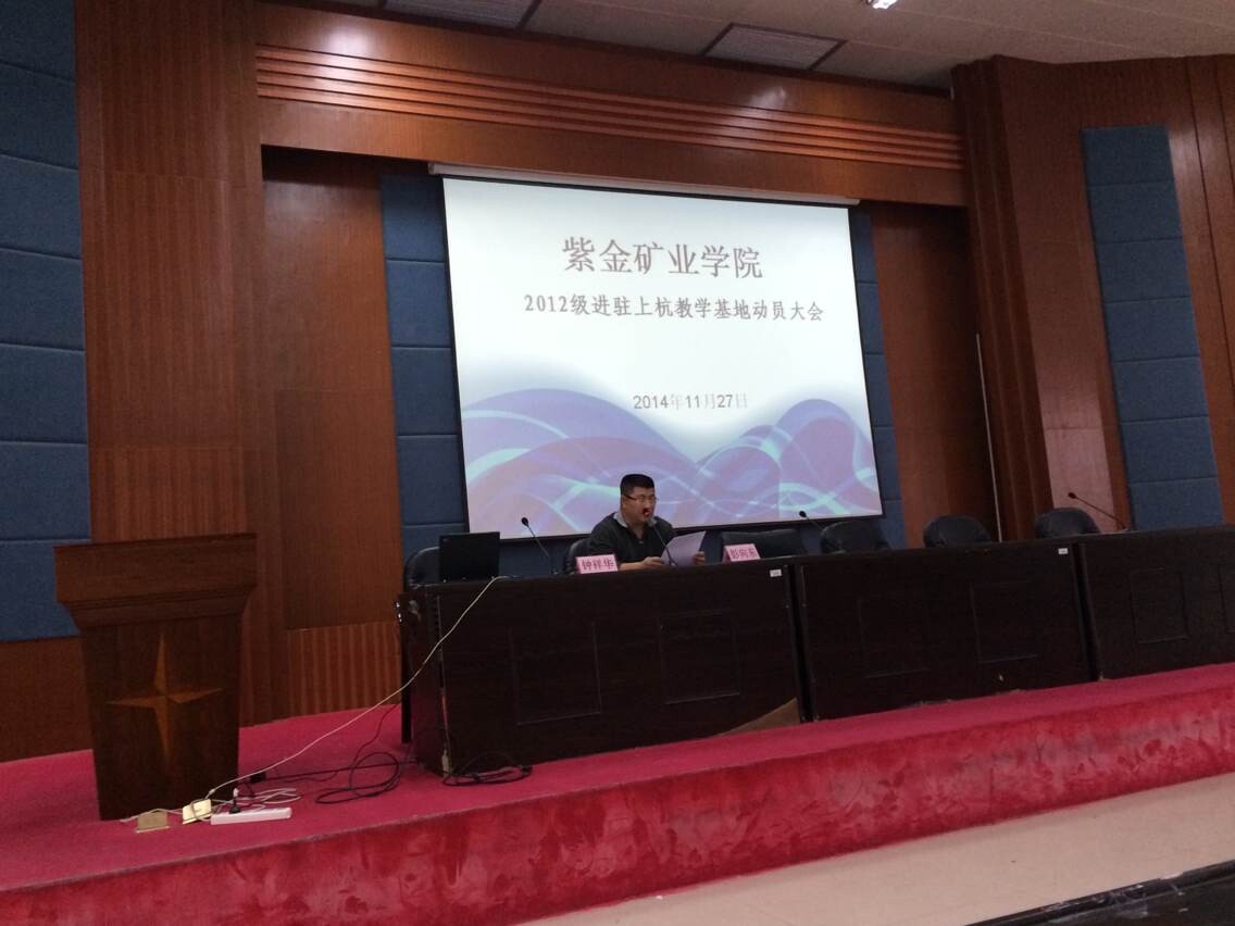 10月27日下午,紫金矿业学院2012级进驻上杭教学基地动员大会在学院三楼学术报告厅召开。副院长彭向东教授、院长助理林国梁老师、院综合办公室副主任钟祥华老师、上杭教学基地教学干事姜秀玲老师参加了动员大会。2012级辅导员翁惠玲主持大会。