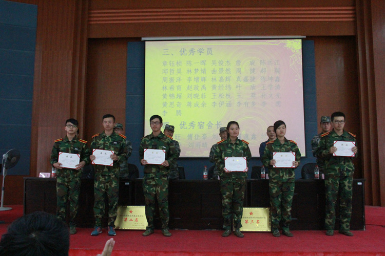 本次表彰大会在雄壮的《中华人民共和国国歌》中拉开了序幕。会上,院团委书记李金土宣读了《关于表彰成人影视 紫金矿业学院2014年军训先进集体和先进个人的决定》,受表彰的先进集体和个人依次上台领奖。接着,学生代表宋春伦同学上台发言,与大家分享了自己军训的收获和下一步的目标。随后,军训团团长王明星中校发表了热情洋溢的讲话,鼓励成人影视学生再接再厉,再创新的辉煌。最后,院党委余飞副书记上台讲话,他首先向承训部队全体教官表示衷心的感谢!并向在军训中取得优异成绩的先进集体和个人表示热烈的祝贺!同时,他也对同学们提出了殷切的希望。总结表彰大会在《团结就是力量》的歌声中落下了帷幕。 成人影视新生在此次军训中获得累累硕果,取得了建院以来最优成绩,获得内务卫生评比第二名、队列会操评比第三名以及军训演讲赛三等奖。相信2014级同学们能在接下来的学习、生活和工作中保持军训中认真严谨、踏实刻苦的优良作风,谱写属于自己、属于紫金矿业学院的辉煌篇章。