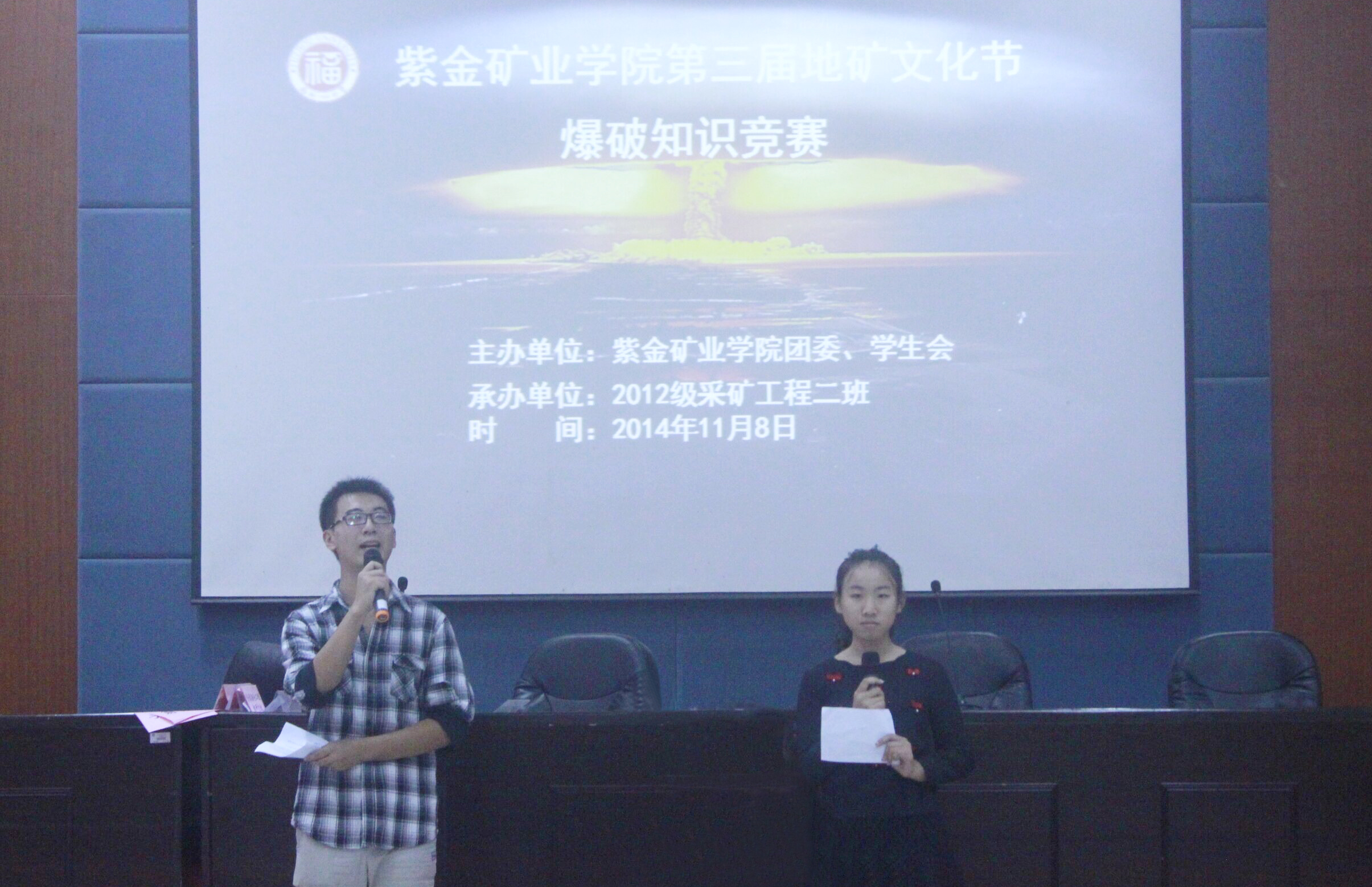 11月8日下午,由紫金矿业学院团委学生会主办,2012级采矿工程二班承办的成人影视 紫金矿业学院第三届地矿科技节爆破知识竞赛在紫金矿业学院三楼学术报告厅顺利举行。学院采矿教研室主任楼晓明、采矿教研室老师刘青灵受邀作为本次知识竞赛的评委。