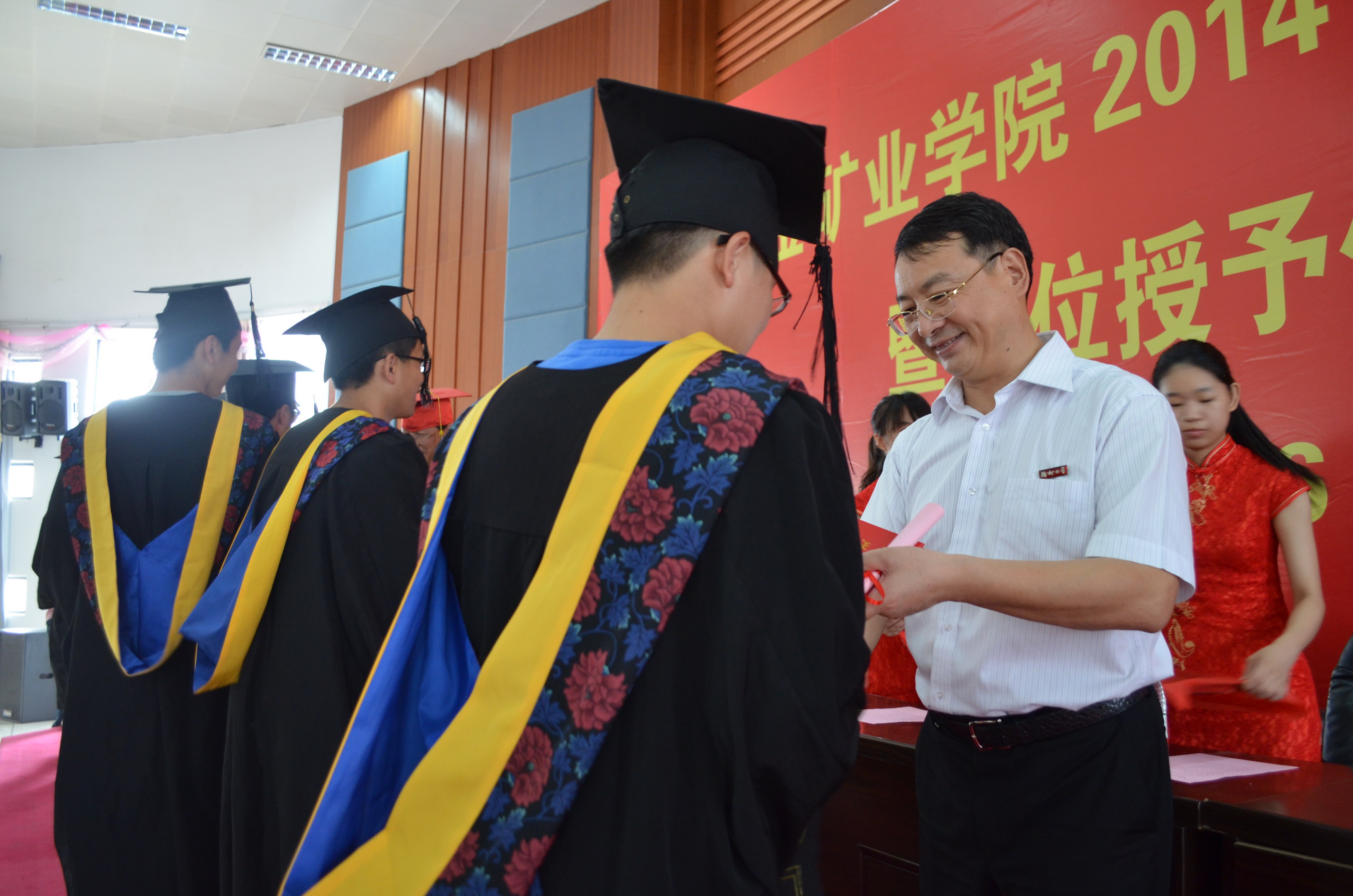 出席典礼的领导嘉宾有:紫金矿业集团股份有限公司董事长、紫金矿业学院理事会理事长陈景河先生;成人影视 校长助理、紫金矿业学院理事会副理事长黄志刚教授;成人影视 教务处处长、紫金矿业学院理事会理事杨晓翔教授;紫金矿业集团人力资源部培训处处长、紫金矿业学院理事会理事谢忠兰女士;紫金矿业集团董事长办公室主任邱国柱先生;学院全体党政领导等。一同见证学院2014届毕业生毕业盛典的还有学院全体教职工、学生家长和学生代表。毕业典礼由学院党委副书记余飞主持。 毕业典礼在庄严的国歌中拉开序幕。余飞副书记首先介绍了莅临毕业典礼的领导和来宾,并向他们的到来致以诚挚的谢意。随后,副院长印万忠教授宣读2014年“陈景河特优毕业生”获奖名单,陈景河董事长等学院第三届全体理事会成员共同为六位获奖学生颁发证书及每人8000元奖金。 学位授予仪式是毕业典礼的“重头戏”。学院教授委员会主任、副院长彭向东教授宣读了本届毕业生名单及获得学位名单。陈景河董事长、黄志刚校长助理为毕业生颁发毕业证书、学位证书,刘羽院长与彭向东副院长则逐一为获得学士学位的毕业生拨穗,与会人员以热烈的掌声对毕业生表示祝贺。 学位授予仪式结束后,福建省三好学生获得者蒋祥伟同学作为毕业生代表上台发表毕业感言,对学校、学院、各位领导老师对他们的悉心栽培致以最衷心的感谢。学院肖爱芳老师则代表全体教师向毕业生表达了最真挚的不舍和祝愿。刘羽院长为毕业生作了一番简短、诚挚的毕业赠言。刘羽院长说,无论学生们以后能否变成高富帅,白富美,他们的身后一直都有学院全体教职工关注的目光,希望大家常回学院看看。 陈景河董事长以校友、学长以及企业董事长等多重身份对毕业生们提出殷切的期望和谆谆叮嘱。陈景河董事长还为大家详细分析了矿业面临的机遇和挑战,希望走上社会的毕业生们能够以高度的责任心为自己奋斗出一片天空。毕业典礼在《勘探队员之歌》中圆满结束。(黄少钦)