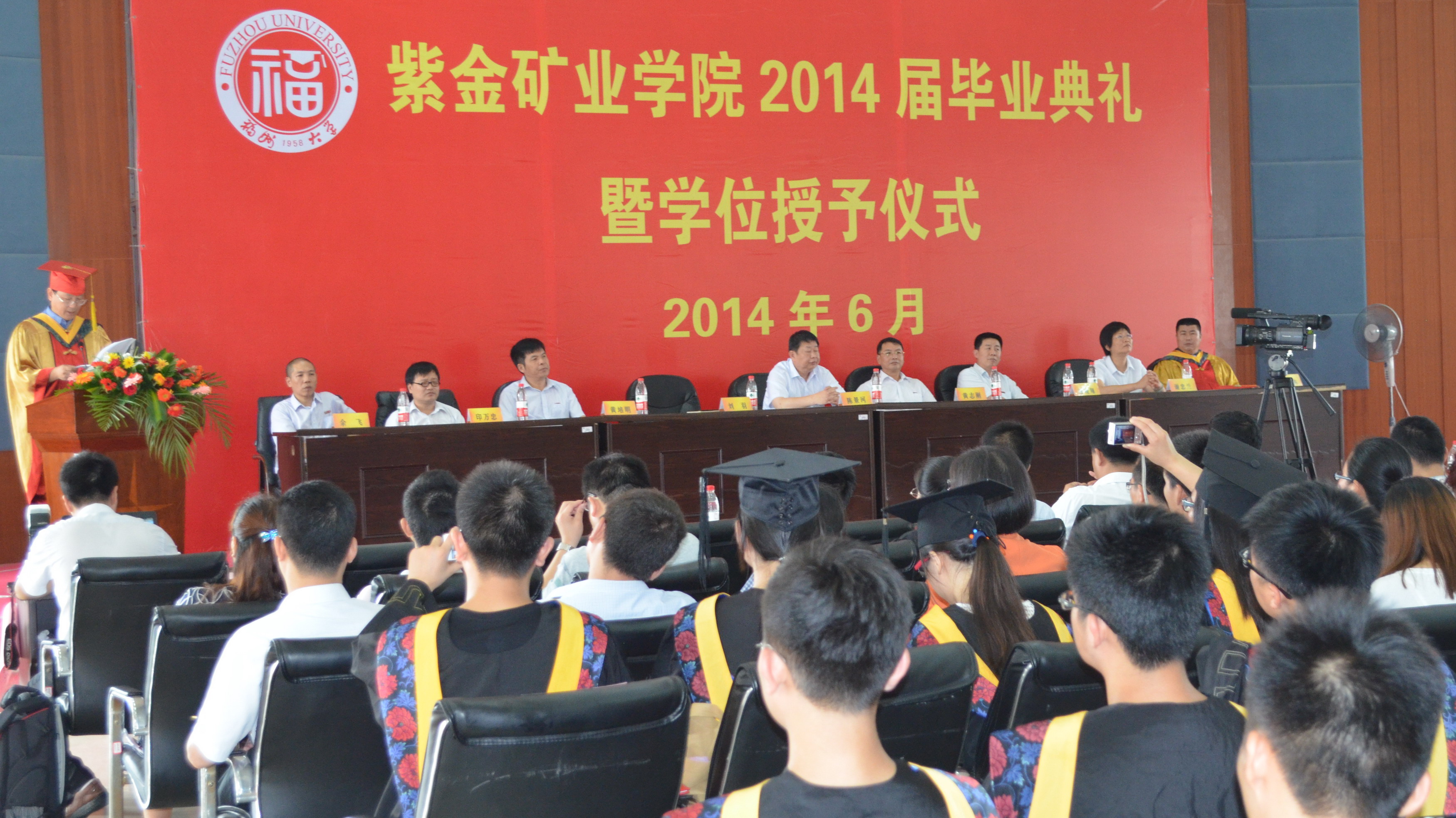 6月19日上午,学院2014届毕业生毕业典礼暨学位授予仪式在紫金矿业学院三楼学术报告厅隆重举行。“今日桃李芬芳,明日国家栋梁”的横幅高悬,与庄严的典礼台和毕业歌曲背景乐共同烘托出喜庆的气氛,2014届全体毕业生满怀自豪端坐会场参加盛典。