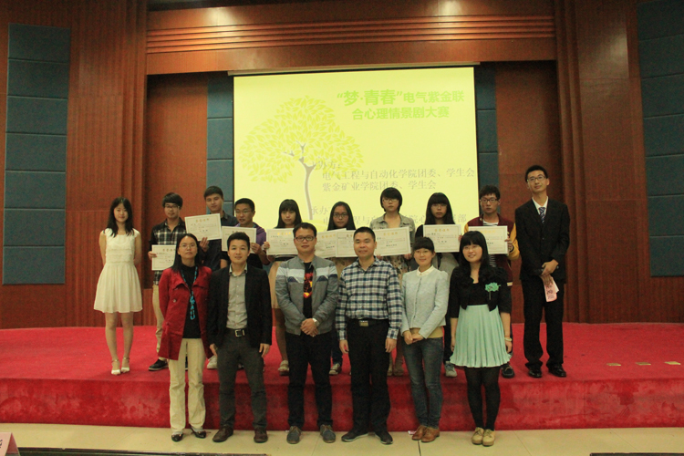 为了丰富同学们校园文化生活,普及心理健康知识,扩大教育效果,成人影视与电气学院于4月20号晚7时在紫金矿业学院三楼学术报告厅共同举办“梦:青春”心理情景决赛。校就业指导中心雷辉、校心理咨询中心黄瑞枫、电气学院团委副书记沈庆斌、紫金矿业学院代理团委书记李金土以及两个学院的辅导员老师出席了本次比赛并担任评委。 来自两个学院的七支队伍参加了本次比赛,《他与他的日常》以同学间日常的矛盾为题,传递着青年人友情的真谛。《我不是学霸》以大学生追求爱情为主线,描述着角色各自隐性心理缺陷,揭示心理对成长的影响。大四抉择,简爱,别离演绎着《且行且珍惜》。身边充满温暖,《幸福》一直在身边,只要对生活充满期待。《新生》经历了生死的迷漫,梦想的力量带来新生的光芒。异地恋的《宇祥愁恋》上映了爱情的真挚,《最好的时光》向我们演示了大学生正确的生活观。演员们精彩用心的表演,绚丽的灯光以及每个剧所要传达的深刻涵义都给观众和评委们留下深刻印象。经过激烈的角逐,来自紫金矿业学院的陈森同学和周游同学分获了最佳男女演员奖,电气学院肖涵忻同学获得最佳编剧奖。剧目《最好的时光》夺得桂冠。 本次心理情景剧两院决赛,各参赛队伍精彩的展现了当代大学生朝气蓬勃,奋发向上的精神面貌以及对人生的思考和感悟,活跃了校园文化,增进了两个学院的交流和合作,推动了心理健康教育的深入发展。(丘世澄 供稿;连文宇 摄影)