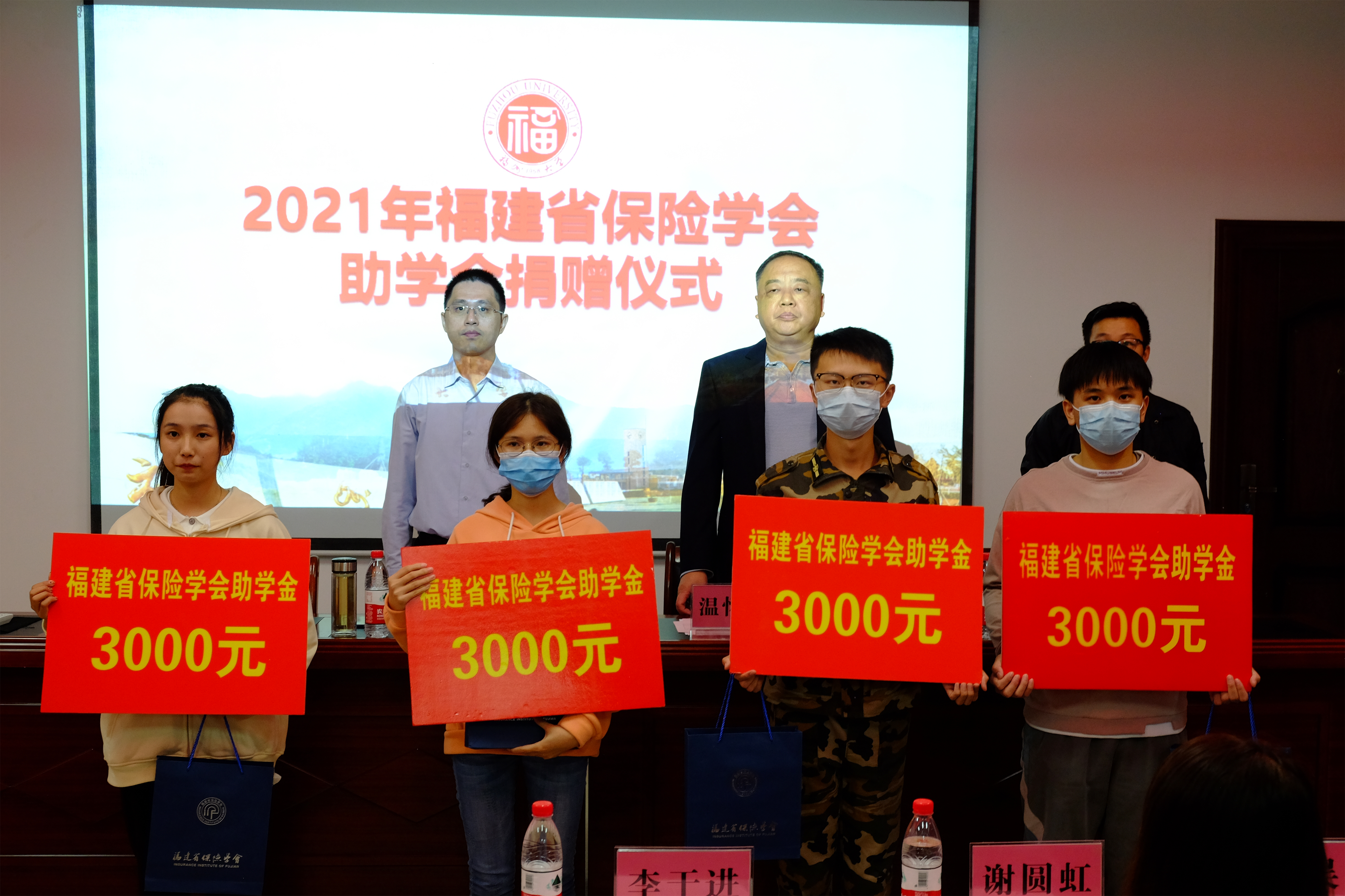 会议伊始,与会领导为四名受助学生颁发成人影视 “福建省保险学会助学金”,并鼓励他们奋发向上,树立不惧艰险、努力奋进的优良品格,以优异的学习成绩来回报社会及学校对他们的殷切关怀,成为新时代的国之栋梁。随后,21级罗盛葳、20级林晓雯作为受助学生代表发言,他们对社会爱心人士的善举表示感谢,并立志努力进取,发奋图强,为今后回报社会奠定夯实的基础。