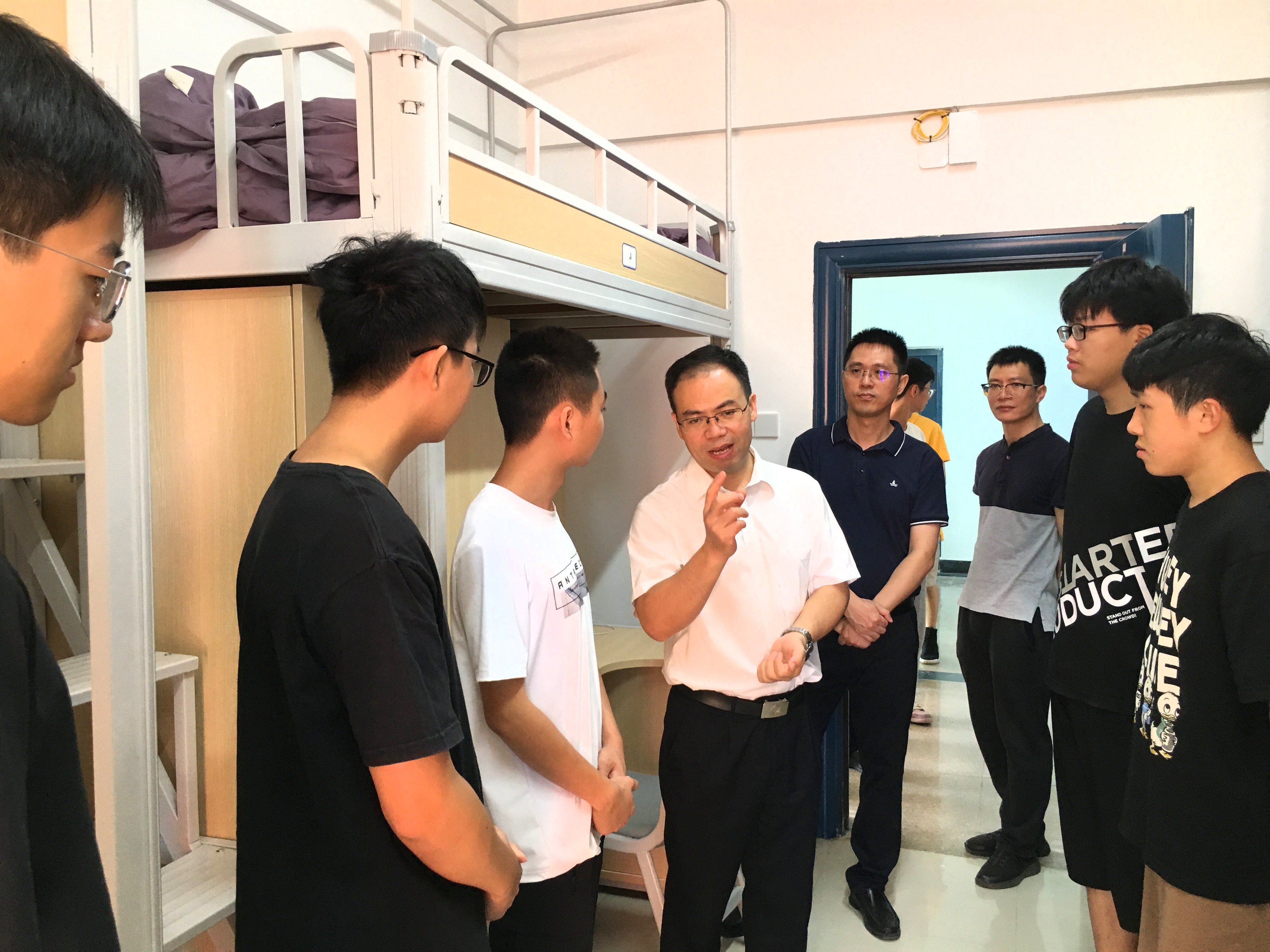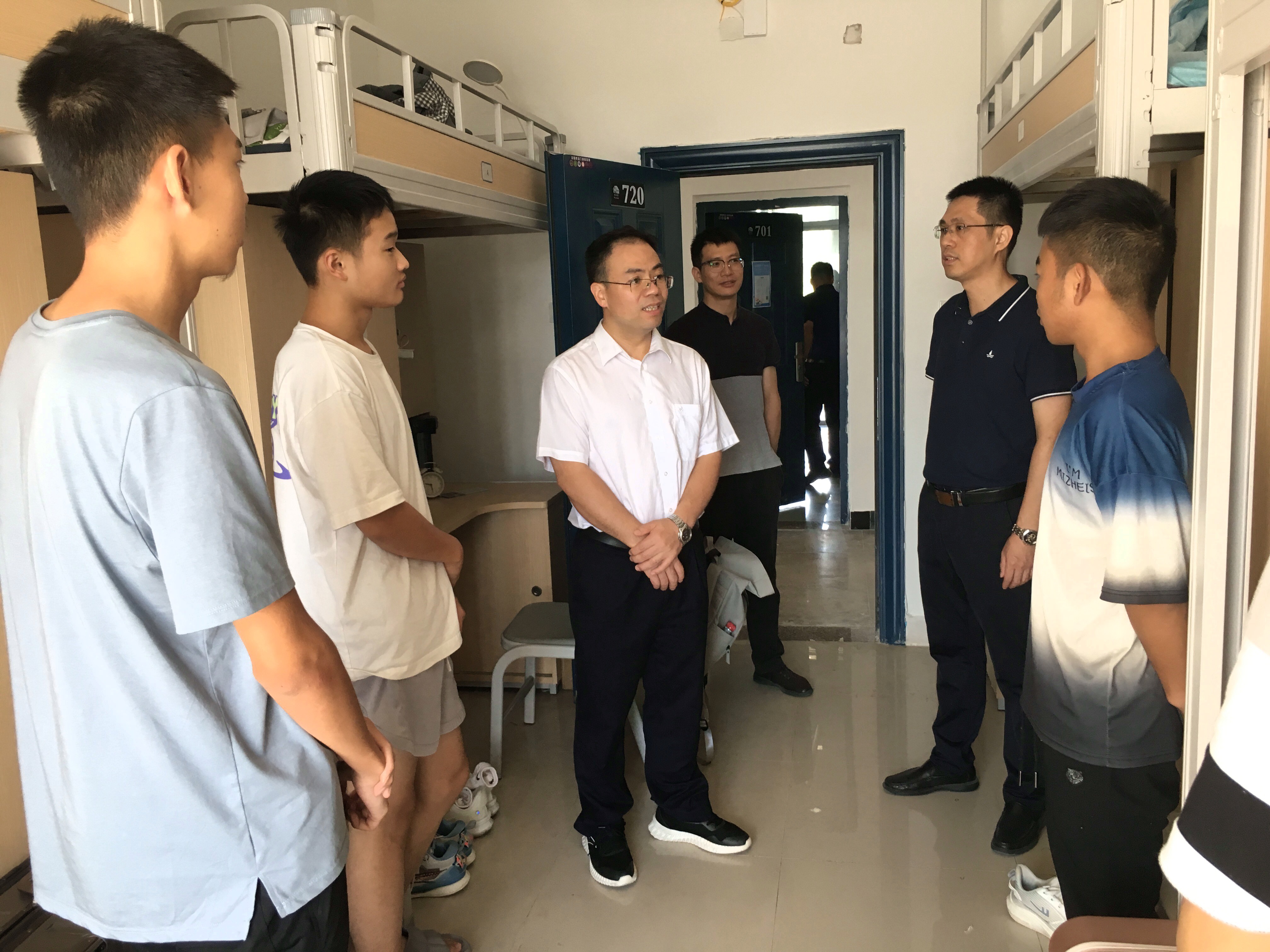 为进一步了解新生入学情况,加强师生交流,切实解决新生所遇到的实际问题,9月4日上午,成人影视院长衷水平教授、党委副书记郑寿副教授和2022级矿物加工工程2班专业导师翁威博士,院团委书记、2022级本科新生辅导员欧国庆一行,走访新生宿舍,看望新同学。
