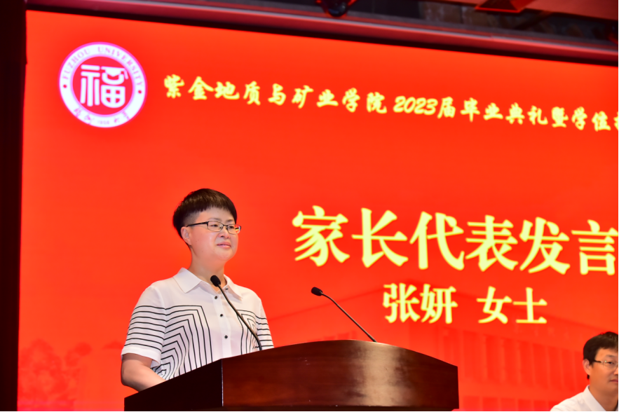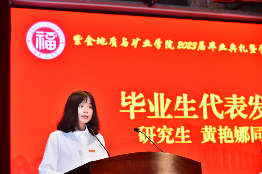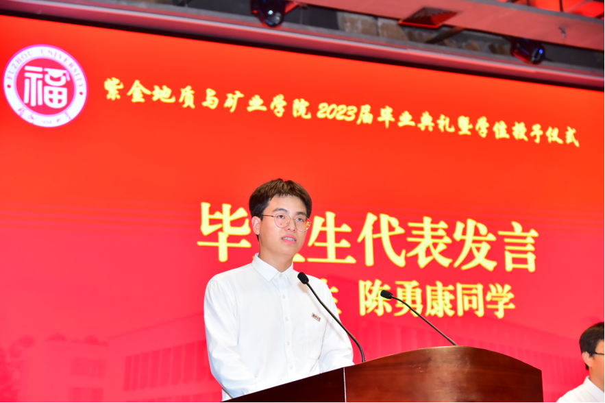 毕业生代表陈勇康和黄艳娜同学讲述了自己难忘的福大学习经历给自己带来的成长,他们代表全体毕业生向紫金矿业集团、学校和学院表达衷心的感谢和祝福,希望同学们在未来的道路上乘风破浪、扬帆起航、奋发图强,成为母校和母院永远的骄傲。