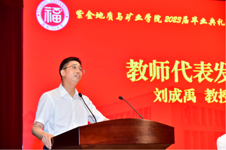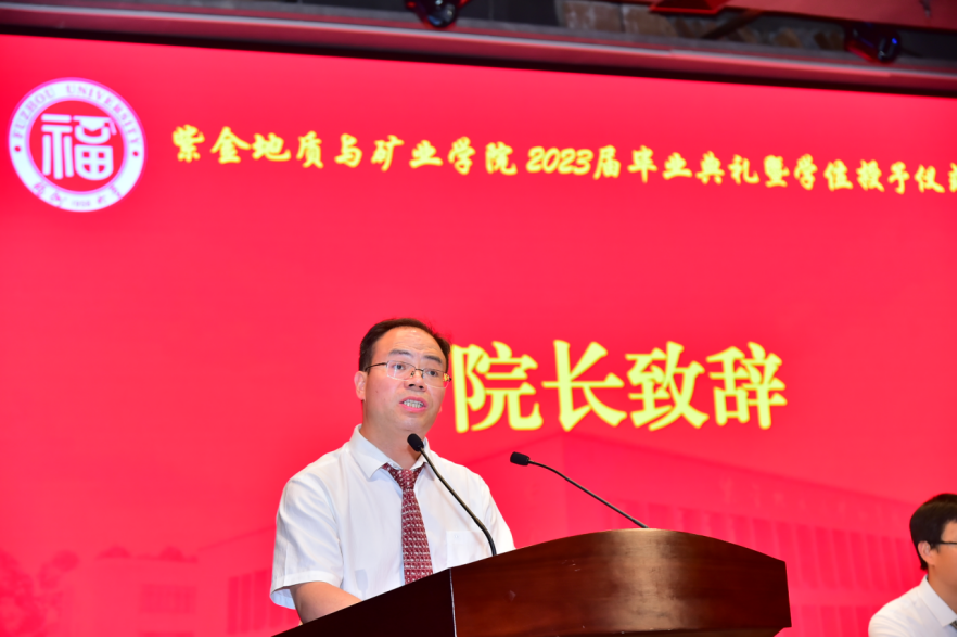 接着,院长衷水平教授发表毕业致辞。他代表全院师生员工,向努力拼搏顺利完成学业的全体毕业生们表示热烈的祝贺。他通过紫金矿业集团发展的“紫金速度”,陈景河董事长身体力行的“奋斗者”,期望同学们做新时代的奋斗者;做一名终生学习者。他祝福同学们在前行的道路上,执一心、忠一道、成一事,不负寒窗,为青春添彩,为理想增色。