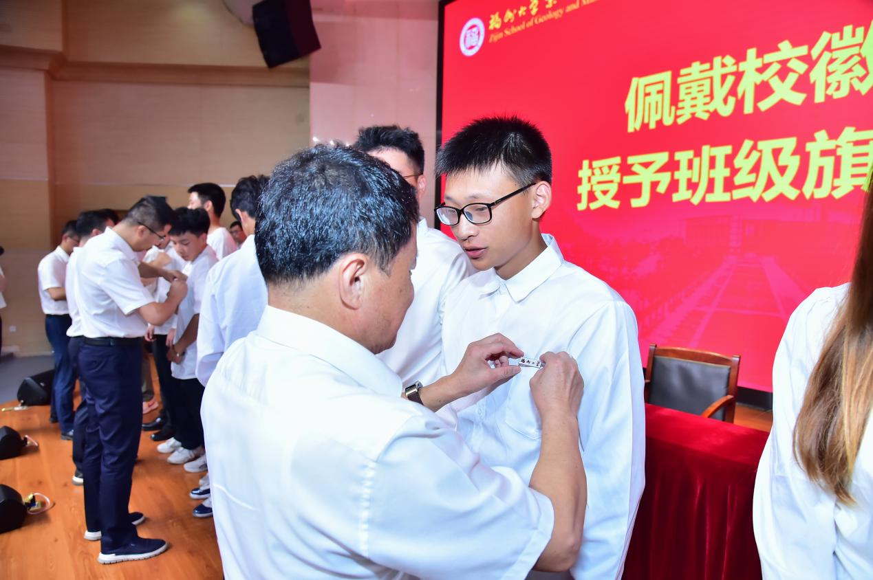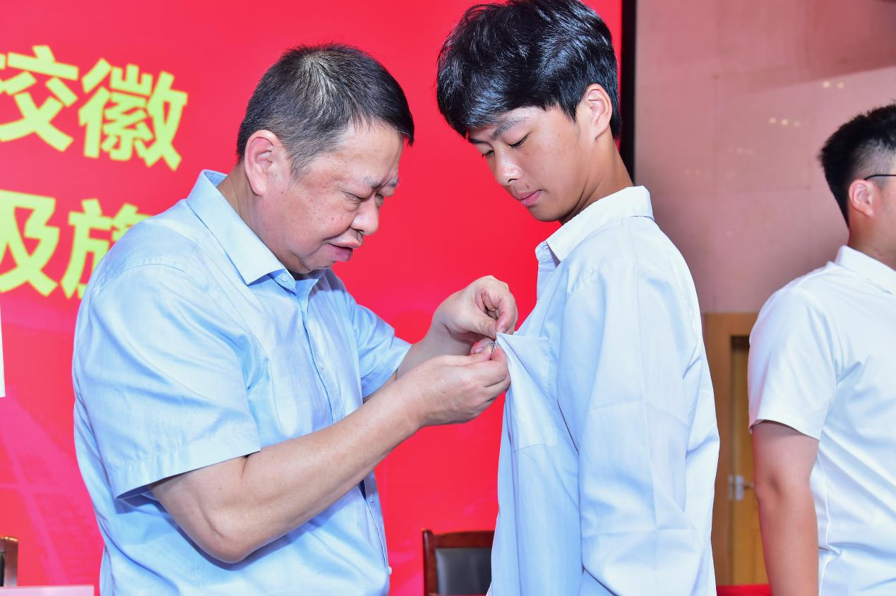 领导、嘉宾为新生代表佩戴校徽, 授予班级旗帜