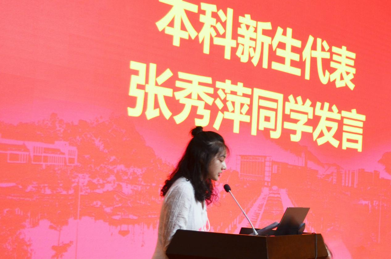 “脚踏实地,仰望星空”,本科新生代表张秀萍同学说:“在学习上,我们要有‘绳锯木断,水滴石穿’的恒心。此外,我们要努力提高自己的动手实践和科技创新能力,在福大这片广阔的舞台自发‘紫金光芒’,做一个有理想、敢担当、能吃苦、肯奋斗的新时代好青年。”