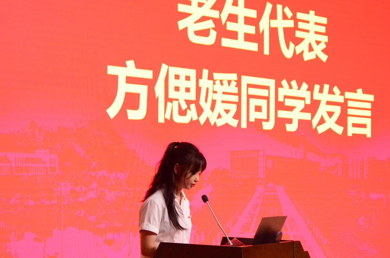 方偲媛同学引言“运筹帷幄,决胜千里之外”,向新生提出三点建议,警醒我们避免“养成惰性,安于躺平”,要及时转变身份,适应大学生活。“老能劝学照余生,似夜随灯到处明”,方偲媛同学建议我们树立自主学习、学无止境的学习观,重视大学基础课程的学习。她寄语新生:“琳琅满目的社团、部门都会为你们敞开门扉,希望你们能在其中找到自己喜欢并愿意为之付出的舞台。”