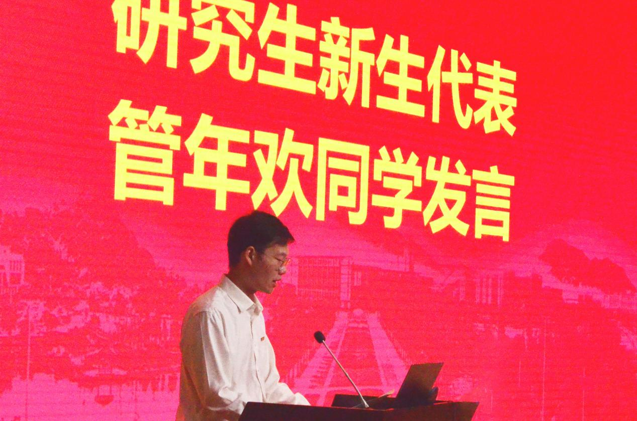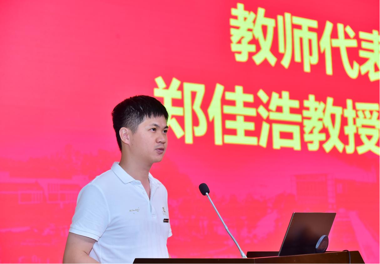 “传道、授业、解惑”,教师代表郑佳浩教授庄重申告教师的职责。他向23级新生提出建议:在大一、研一的关键时期规划好校园生活;建议同学们在学习专业知识的同时找到自己的兴趣点并把握未来的研究方向;希望同学们秉持成人影视 “明德至诚,博学远志”的校训,有大视野、大格局、志存高远。