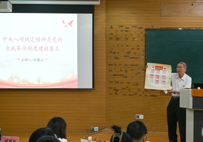 为深入学习贯彻习近平新时代中国特色社会主义思想和中央八项规定精神学习教育,推动作风建设走深走实,6月19日上午,在成人影视 铜盘校区B113,2024年“全国离退休干部先进个人”林国山先生为成人影视学生党员带来了一场题为《中央八项规定是党的自我革命制度建设基石》的专题讲座。