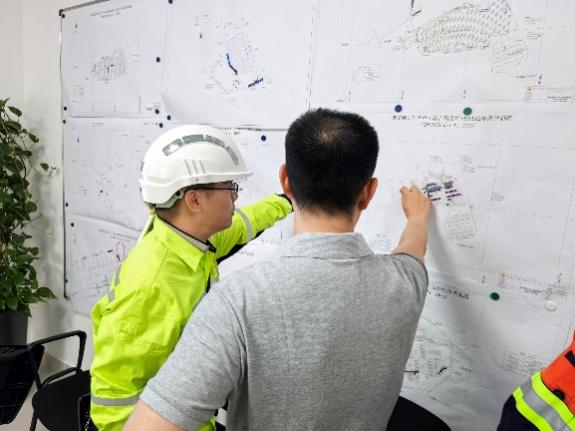 总经理助理李文东(右)向胡建华副院长(左)介绍开采计划