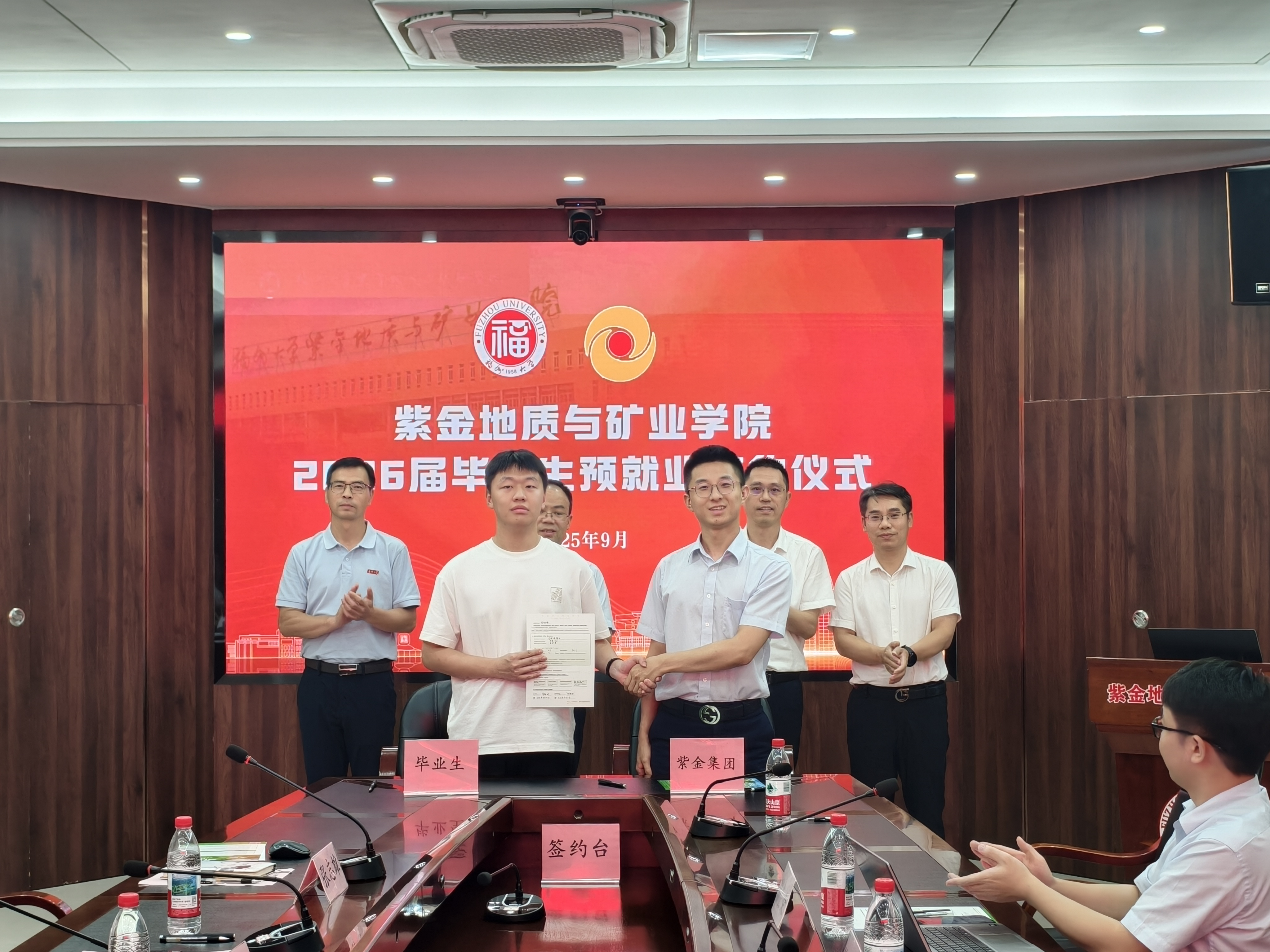 9月11日下午,成人影视2026届毕业生紫金矿业集团预就业签约仪式在紫金楼219会议室举行。紫金矿业集团紫金黄金国际人力经理张震环、紫金集团总部招聘干事谢金荣、学院党委书记郑寿、院长衷水平等出席了签约仪式,签约仪式由党委副书记张志雄主持。