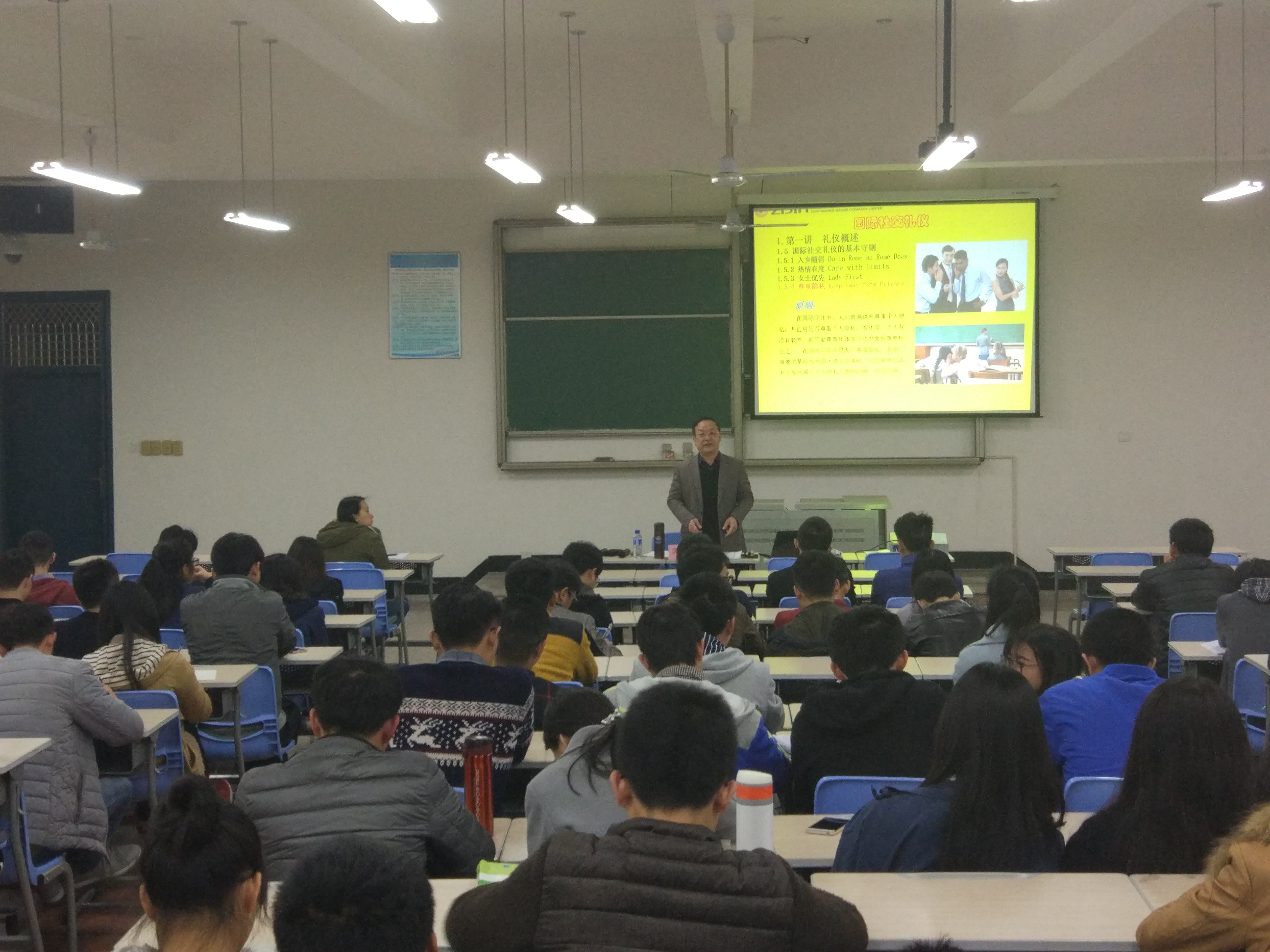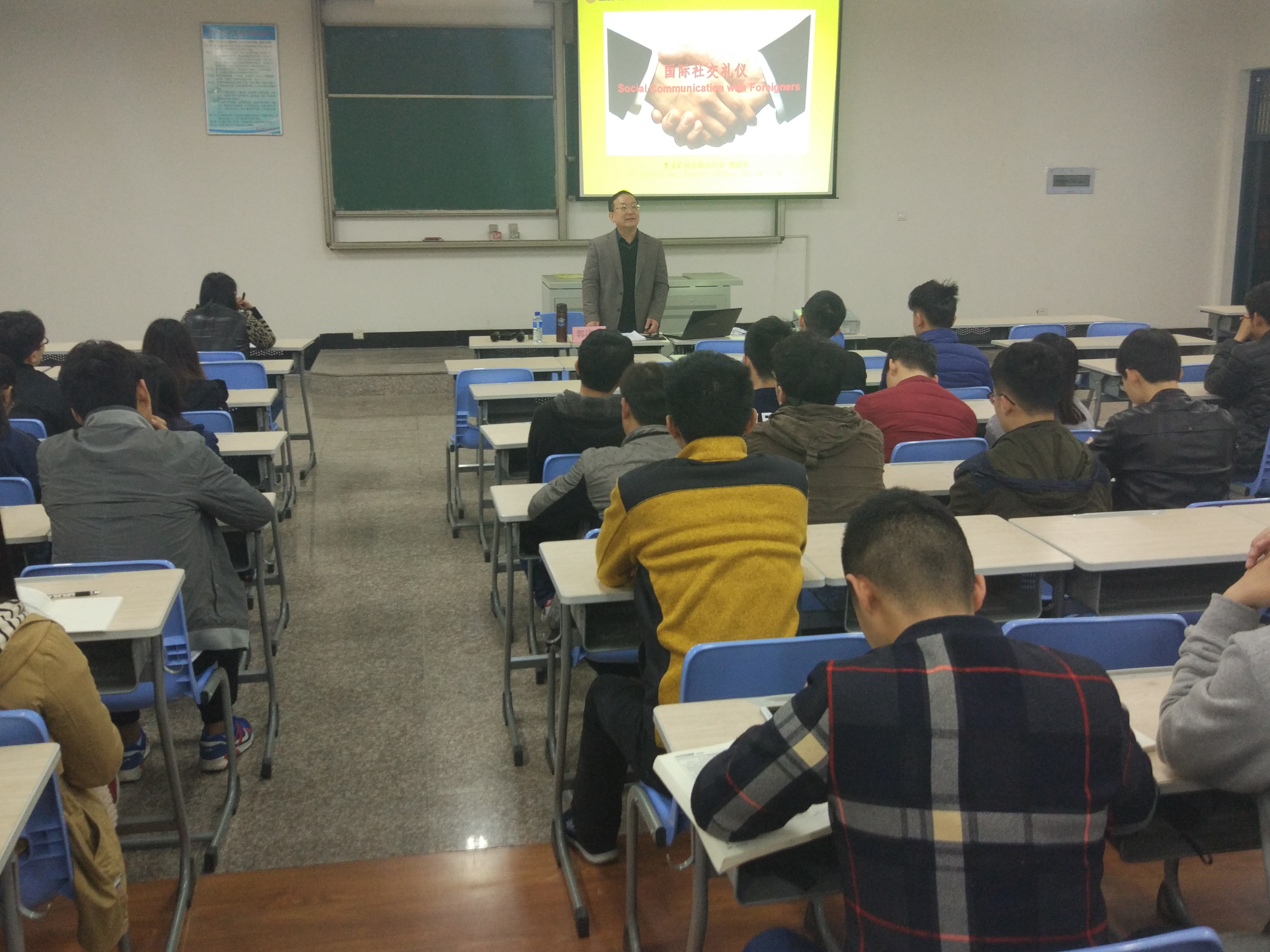 郭先生从礼仪的起源开始,概述了礼仪的定义,分别阐释了礼和仪的含义。他还用自己的理解定义了礼仪,即:成文的或者不成文的必须自觉遵守的但违反后又不能用法律制裁的行为规范。接着,郭先生深入浅出地引出了国际礼仪,入乡随俗,热情有度,女士优先,尊重隐私是其基本守则。期间,他还结合自身的经历,畅谈国际礼仪趣事。之后,郭先生从形象、着装、手势、言谈和礼貌等方面入手教大家如何学习礼仪。
