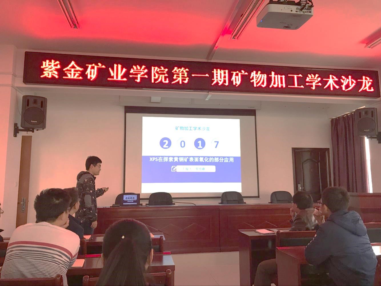 沙龙伊始,印万忠教授讲到,矿物加工系开展沙龙系列活动,旨在提供师生学术交流的平台,通过长期定期开展,师生相互交流、相互沟通、相互启发、相互补充,实现教学相长,营造浓厚的科研学术氛围。接着,本期沙龙由矿物加工系研究生二年级学生辛靖靖和李欣峰分别做了以“微生物浸矿”和“XPS技术在黄铜矿表面氧化研究中的应用”为主题的研习成果介绍,并汇报了各自的课题进展情况。