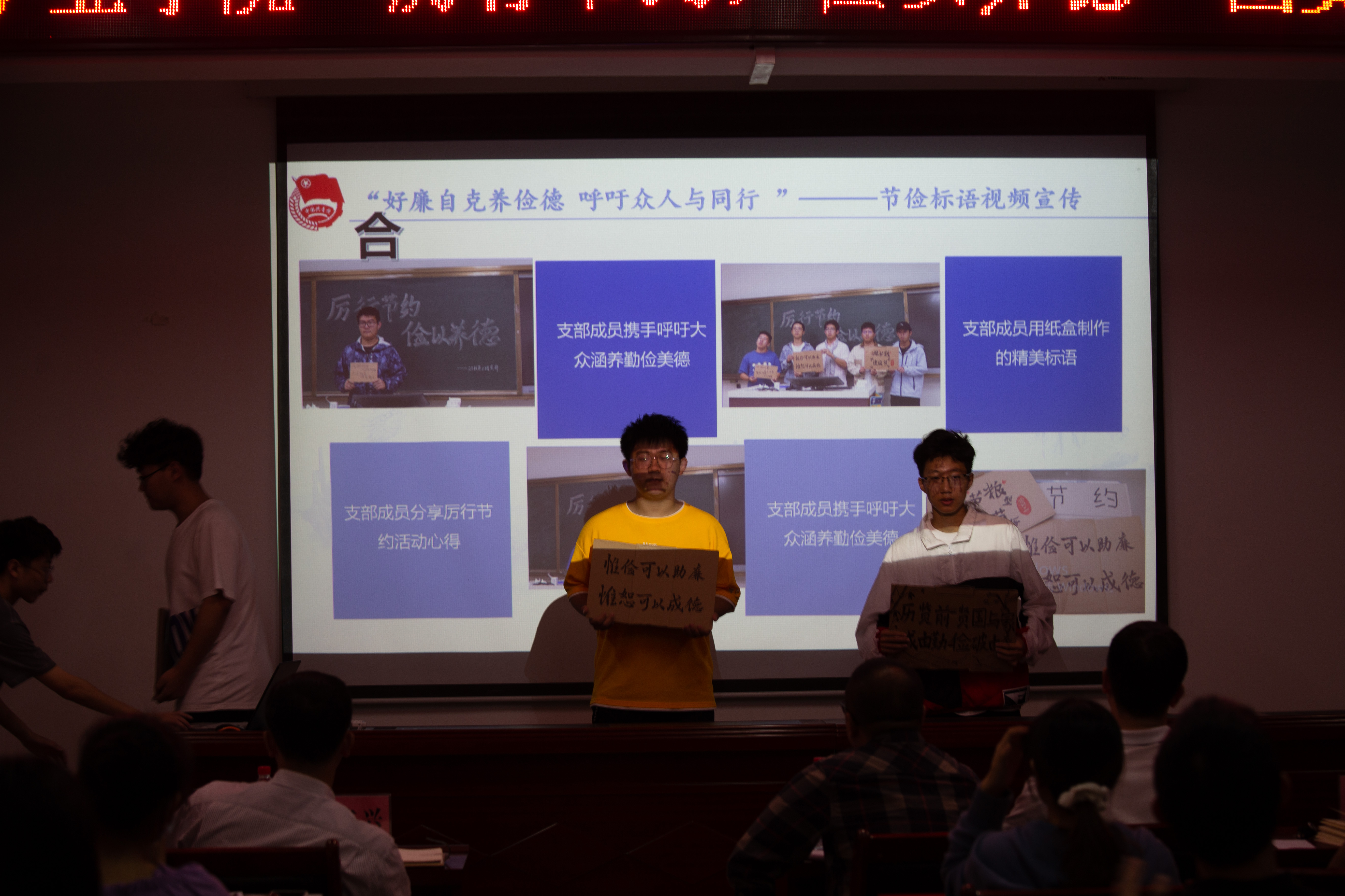在本次活动中,各团支部以PPT讲演形式为主,辅以朗诵、节俭标语展示、书法展示和播放采访视频等方式,向大家介绍了各班级开展的不同活动和取得的成果,并从不同的角度诠释了“厉行节约,俭以养德”的主题。其中,19级矿物加工工程一班团支部以出色的演讲、精彩的活动展示,从多个角度介绍了自己班级活动的丰富多彩和同学们认真对待的态度,得到了在场师生的一致好评。20级矿物加工工程一班团支部提出的出宿舍随手拉电闸活动,呼吁同学们“节约从生活的细节做起”。20级矿物加工工程二班则开展了“践于共享,育于点滴”共享食堂活动,号召同学们一起以行动践行节俭节约。各班级团支部的出色展示,向在座的领导老师还有同学们展示了各支部和谐友爱的氛围和同学们丰富的课余生活,引导在场的观众加深对勤俭节约的理解,树立起正确的劳动价值观。
