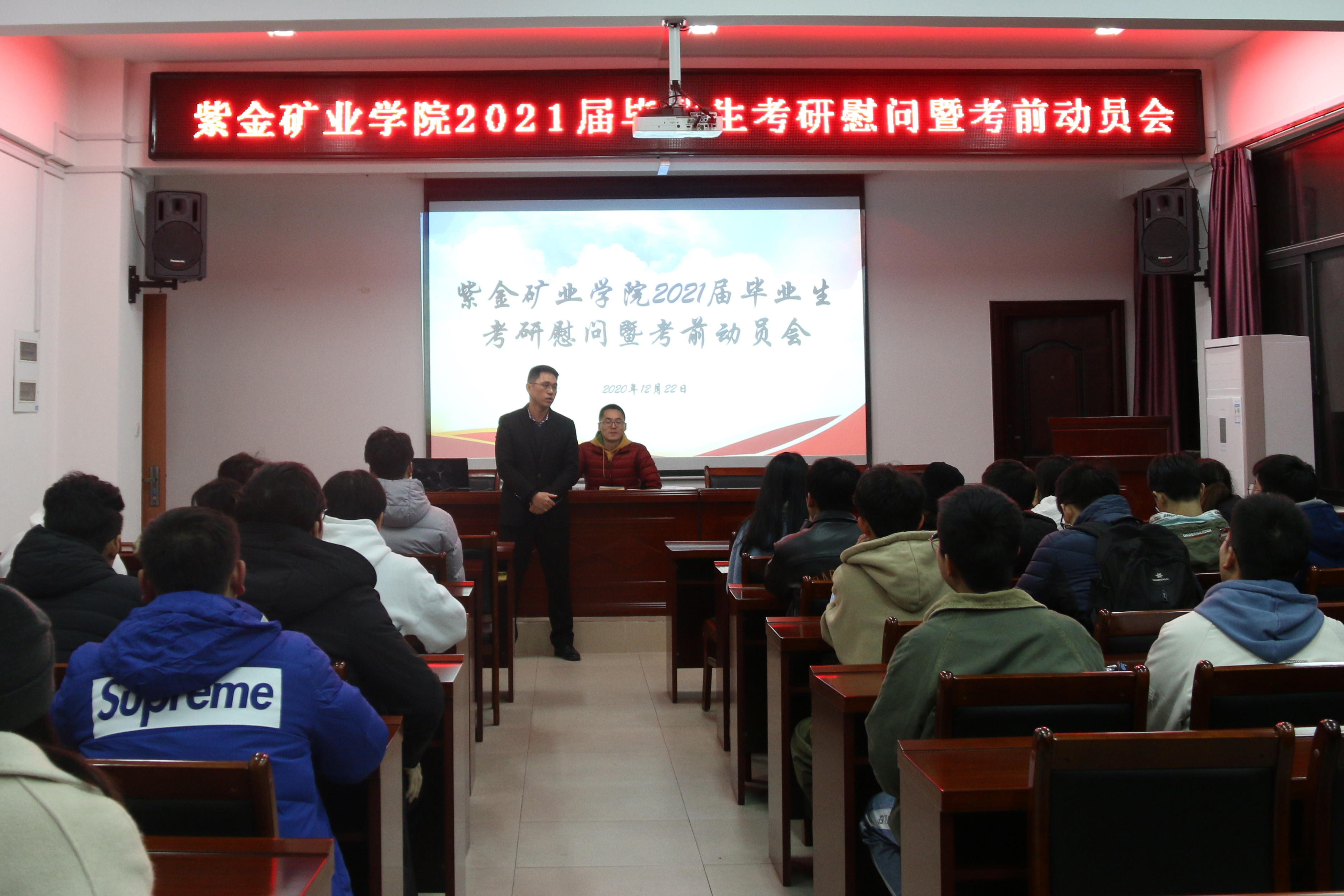 为帮助成人影视2017级考研同学们保持稳定的考前情绪,并对考研形势和考研意义拥有更加深入的了解,进一步坚定考研信念,顺利完成考前准备工作,12月22日晚,成人影视于紫金楼304会议室召开2020年考研动员大会。出席本次会议的领导老师有院党委副书记郑寿老师和17、18级辅导员李延老师,成人影视2017级备战考研的部分本科生参与了本次动员大会。