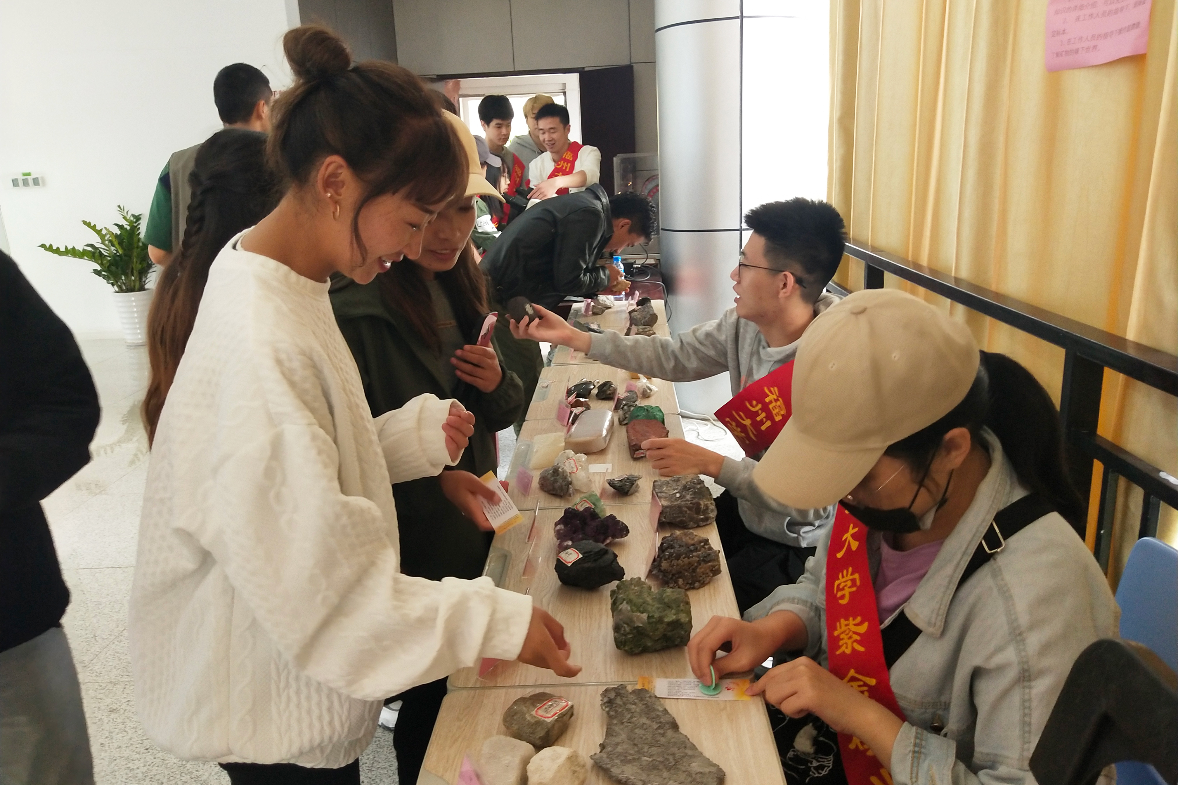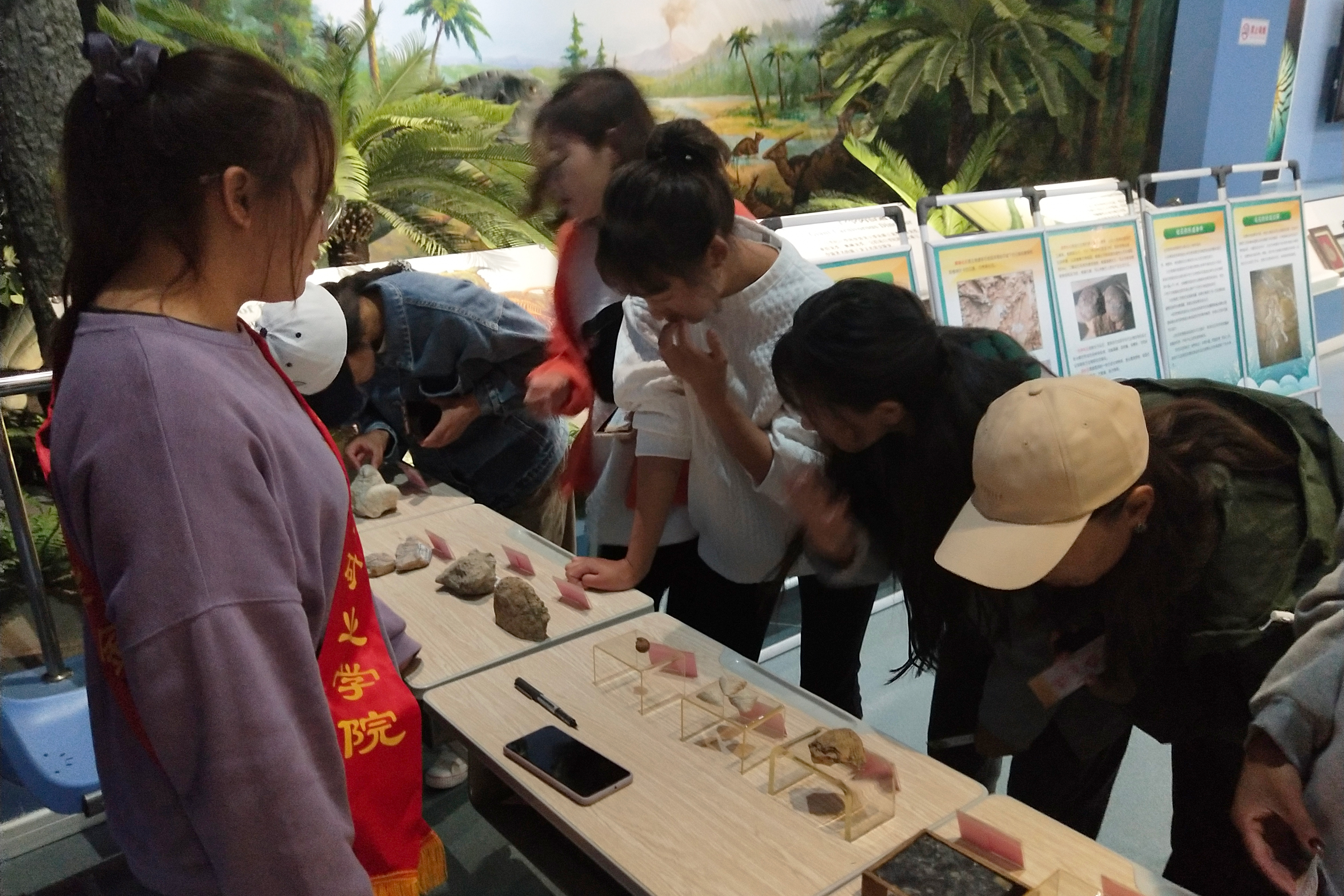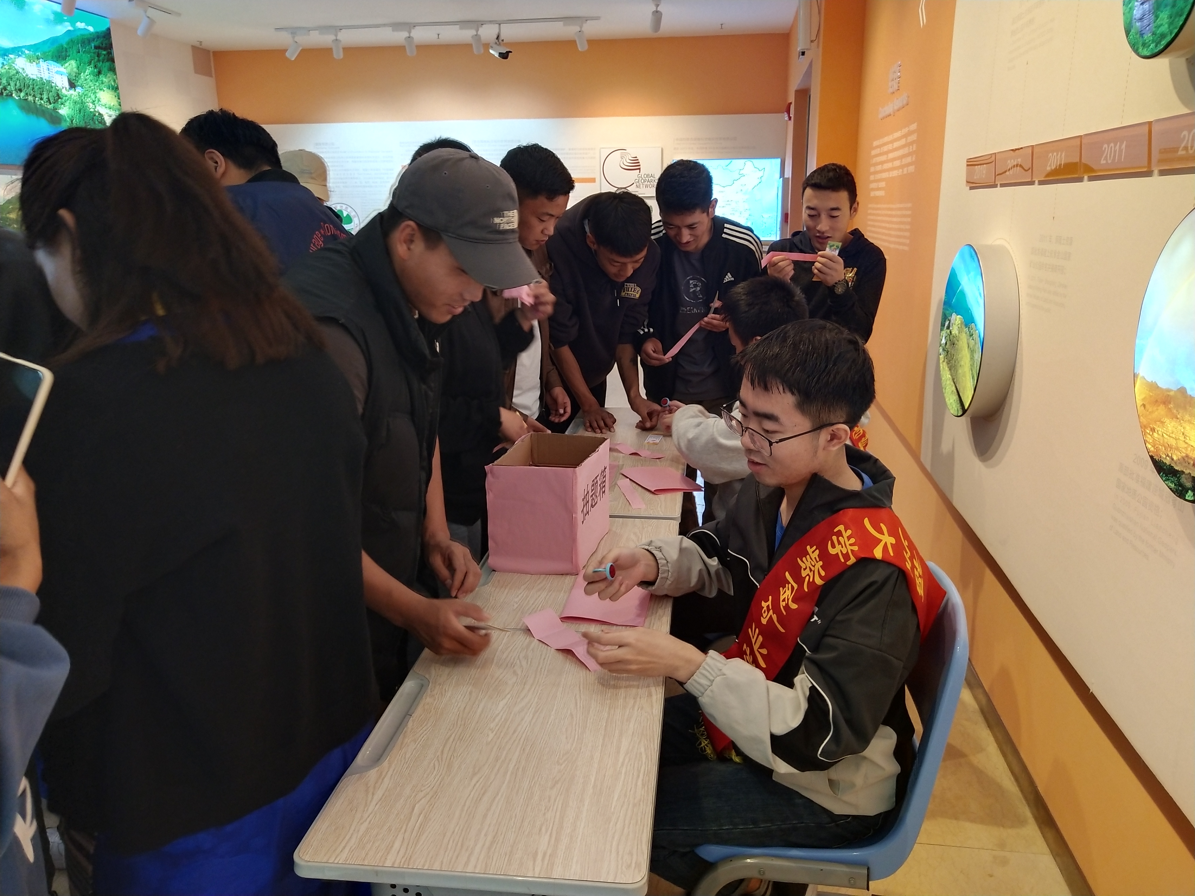 本次活动共分为博物馆讲解、鉴别矿物、找化石小游戏和知识问答四个环节。在博物馆讲解环节中,经过培训的两位同学协助博物馆管理员进行讲解工作,向参与活动的同学以及藏族同胞详细介绍了各种矿石的形成条件以及元素组成。讲解过程中,成人影视同学积极与藏族同胞展开交流,相互沟通学习。博物馆的工作人员还提供了放大镜、划刻板、显微镜等鉴别工具,同学们可以通过动手刻划、显微镜观察来发现矿石性质的差异,切实体会到鉴别矿石的方法和乐趣。找化石小游戏则要求参与者们熟悉矿石的各种性质,通过观看移动展板的内容,了解各种化石类型,并在工作人员的指示下旋转十圈后,找出指定的化石种类。在最后的知识问答环节中,工作人员准备了有关“建党百年”、“环境保护”以及“地矿知识”的题卡,帮助同学们和藏族同胞们多方位地了解国家建设和矿业开发的相关知识,成为真正有理想、有信念的地矿人才。