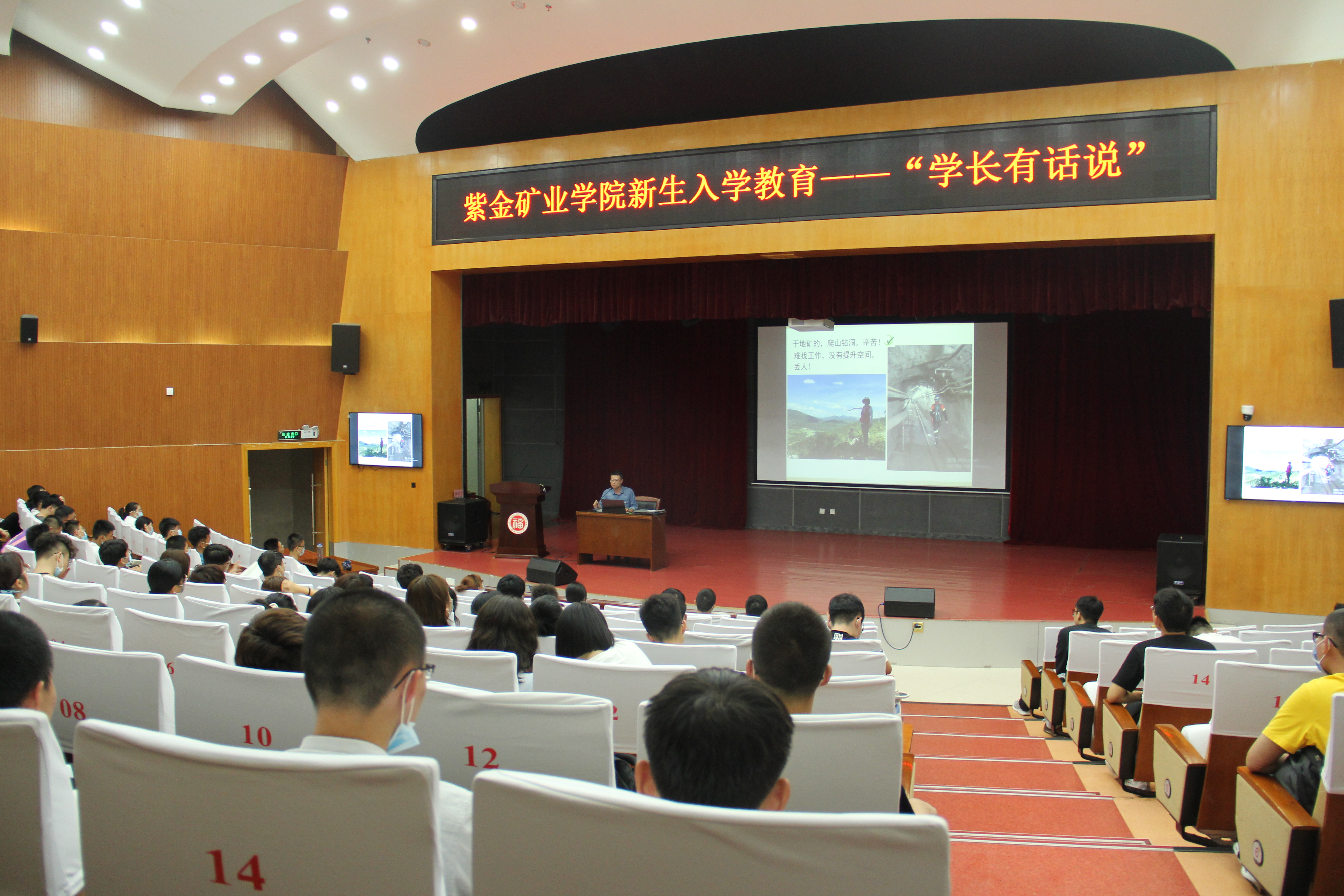 会议开始,林木森老师对地采复合班进行了简单的介绍,林老师说到:“地采复合班打通了资源勘查工程和采矿工程这两个工科专业的壁垒,探索地质与采矿专业复合型人才培养的新路径,此举为全国地矿类专业首家打通工科专业壁垒的尝试,更是顺应企业需求的一种培养方向。”随后,由三位来自地采复合班的同学们向2020级新生分享了他们在地采复合班的见闻与收获。陈镜文同学在发言时向同学们讲述了他在假期到野外找矿石、挖化石的经历,他说到:“我们去野外勘探地质、寻找矿物虽然很累很辛苦,但是看到一天的收获还是非常有成就感的,因为热爱地矿行业,所以对地质类的工作一直拥有很大的兴趣。”叶子同学在发言时则提醒20级新同学们:“地采复合班既是一种机遇,也是一种挑战。选择加入这个班级,课程较原有的专业会更多更难,这就需要我们更加努力的学习,当然,在付出的同时也会收获更多的知识技能与自我管理的能力。”赵骏峰同学运用多媒体向新生们展示了学院的各类研究设施与器械,并对使用方法做了简单的介绍,他鼓励20级新同学们尽快寻找到对专业的兴趣与爱好,扭转对地矿专业的认知误区,并早日投入到大学专业学习中,为大学四年的生活展开一个美好的开端。