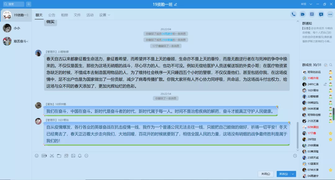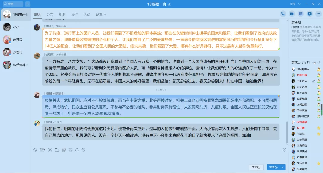 近期,受疫情影响,云端授课,成人影视各班级利用微信、QQ、钉钉等网络平台,开展有关防疫政策和知识、抗疫先进典型事迹等为主要内容的网络主题班会,大力宣传有关防疫科学知识,学习抗疫典型事例和先进个人事迹,为筑牢抗疫防线、科学防疫奠定坚实基础,不断弘扬新时代正能量,激发抗疫到底的决心,坚定抗疫必胜的信心!