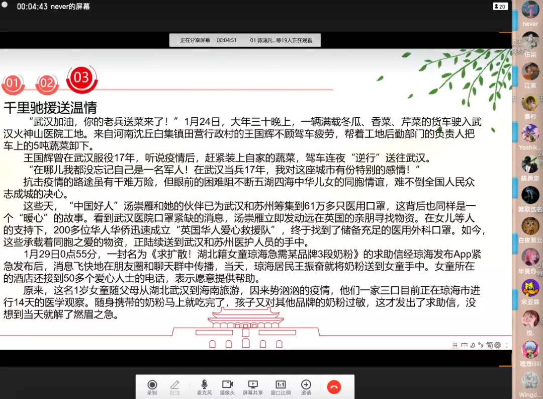 在“众志成城,共抗疫情”三行情书献抗疫英雄线上征集活动中,成人影视面向全体师生征集“写给奋战在一线工作人员的三行情书”,活动共收到“三行情书”多达百余封,取得了良好的反响,同学们在“情书”中写到“同阵抗疫”、“山河无恙”、“共盼春来”等词句,表现出对全民战役胜利、国泰民安的深切期盼。学院还在线上展开了“点赞逆行者”活动,征集原创MV、原创书法等优秀抗疫作品,为奋战在一线的抗疫人员加油助威。除此之外,为了大力宣传防疫科学知识和政策,成人影视各基层团支部召开“防疫情,定决心”主题班会,学习抗疫典型事例和先进个人事迹,并于清明时节号召同学们在“中国文明网”、“中华英烈网”等网站参与“网上纪英烈”,纪念牺牲在抗疫一线的医务工作者,弘扬广大医务工作者“舍小家为大家”、“视死如归”的崇高精神和宝贵品质。