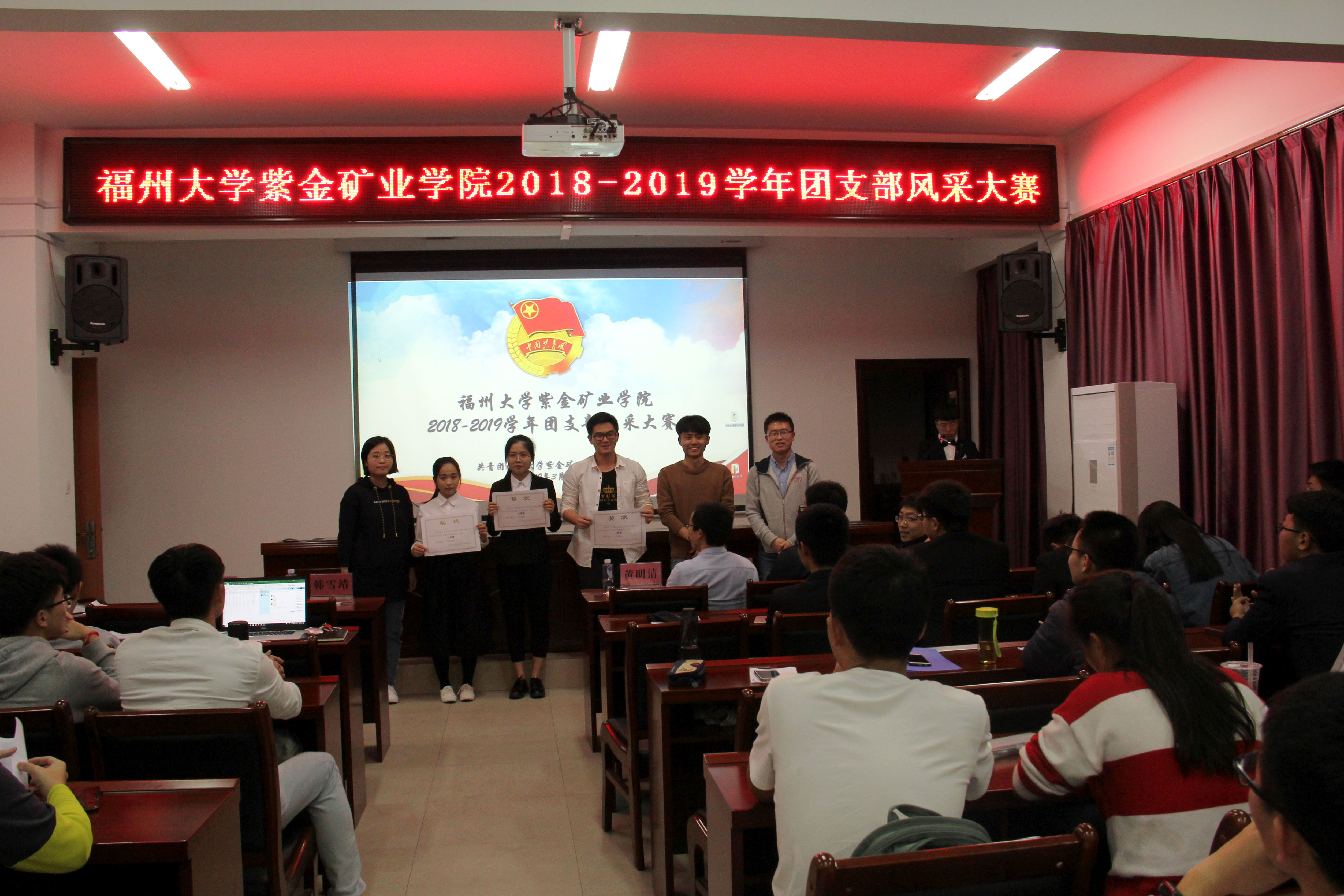 为展示当代大学生的精神风貌,增强团支部的活力和凝聚力,3月20日晚紫金矿业学院2018-2019年度团支部风采展在紫金楼304报告厅顺利举行。专业班导师邓荣东、王力圆、黄明清,2016、2017级辅导员翁惠玲,兼职辅导员吴晓林、韩雪靖出席本次活动,各年级学生代表观看了本次大赛。