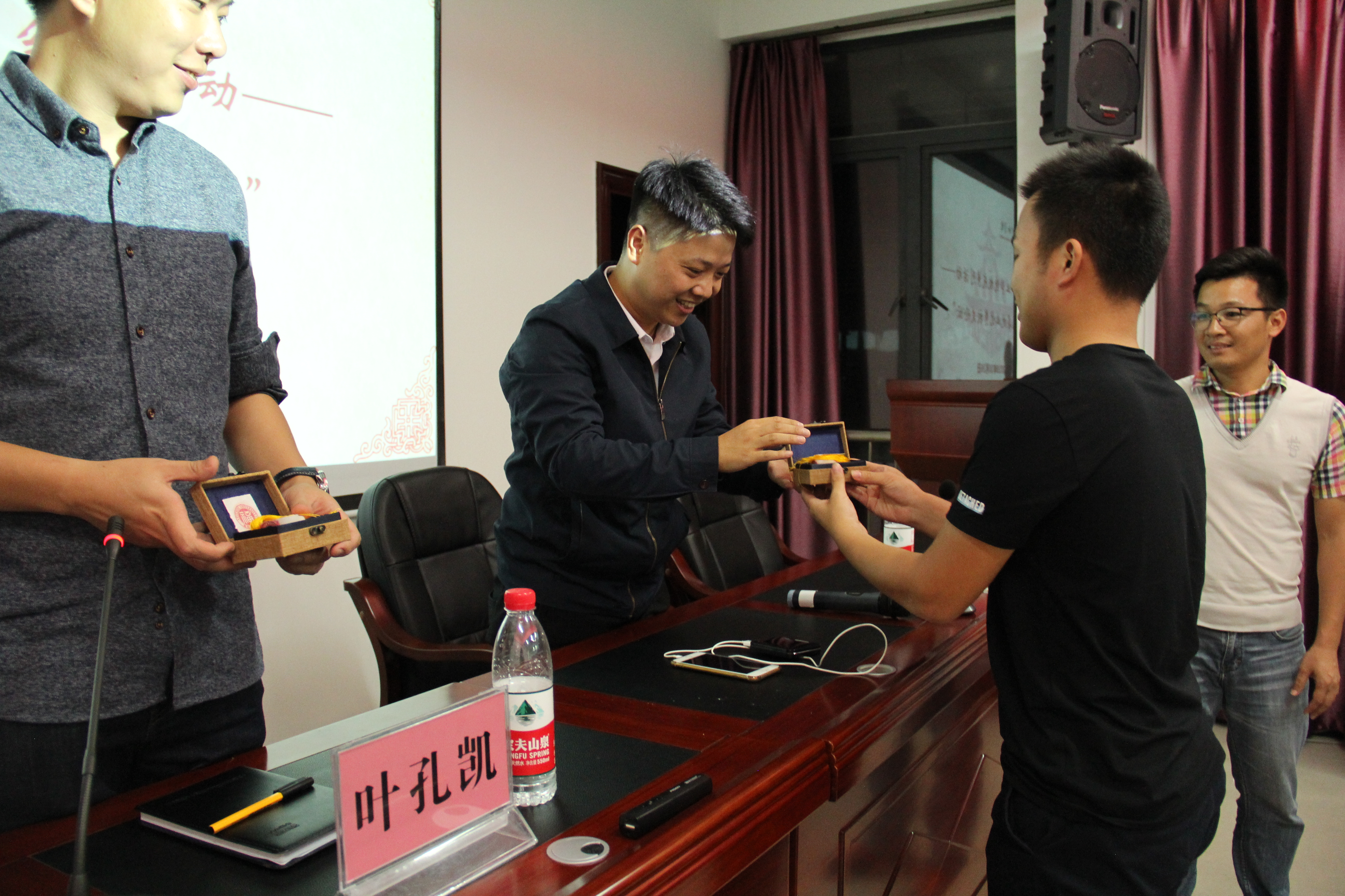 此外,院团委副书记江建辉同学为两位校友献上成人影视纂刻协会精心准备的六十周年校庆纪念品,表达了同学们的感谢之情。