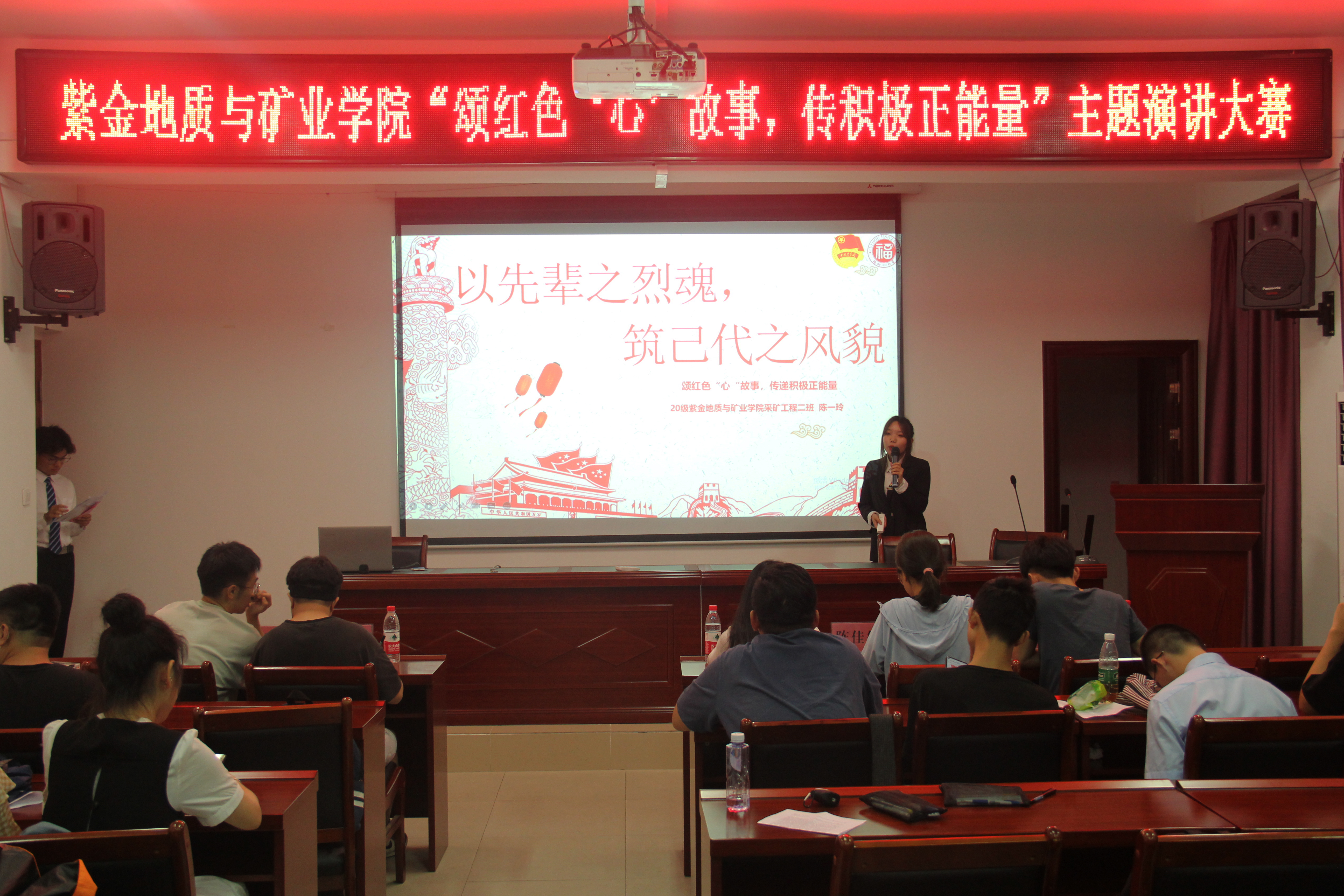 比赛过程中,各位参赛选手通过慷慨激昂的演讲,配合PPT与视频媒介展示,介绍浴血奋战的人物,讲述生动感人的故事,带领同学们回顾建党百年的风云岁月,追思先辈的丰功伟绩。选手们以一个个震撼人心的红色故事,一段段可歌可泣的英雄传奇,让现场每一位观众接受了一次红色教育的洗礼,激发了同学们强烈的爱国主义情怀。其中,20级矿物加工工程二班的张洪彬同学在演讲时说道:“今年是建党100周年,作为青年大学生的我们,应该一心向党向人民,同时还要学好党史,认识更多的英雄人物,从他们身上汲取更多精神以此提升自己的品质。”