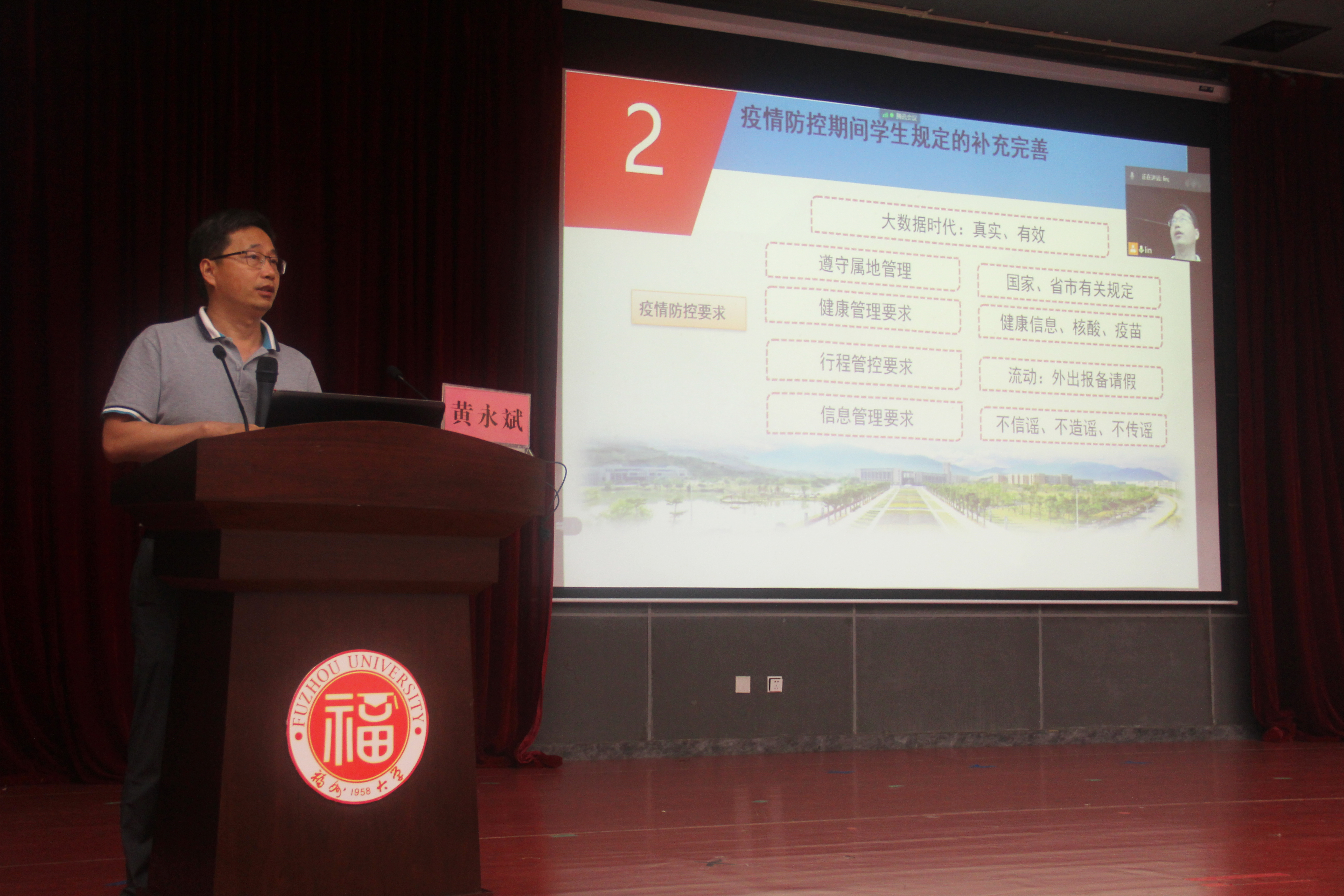 为帮助成人影视2021级新生熟知新冠肺炎疫情防控知识,顺利开展新冠肺炎疫情防控工作,明确成人影视 校规校纪以及各项奖惩制度,9月8日19:00,成人影视于图书馆明德厅开展2021级新生入学教育之疫情防控及学生管理规定解读培训。本次培训由学生工作处黄永斌老师主讲,成人影视2021级全体新生参与学习。