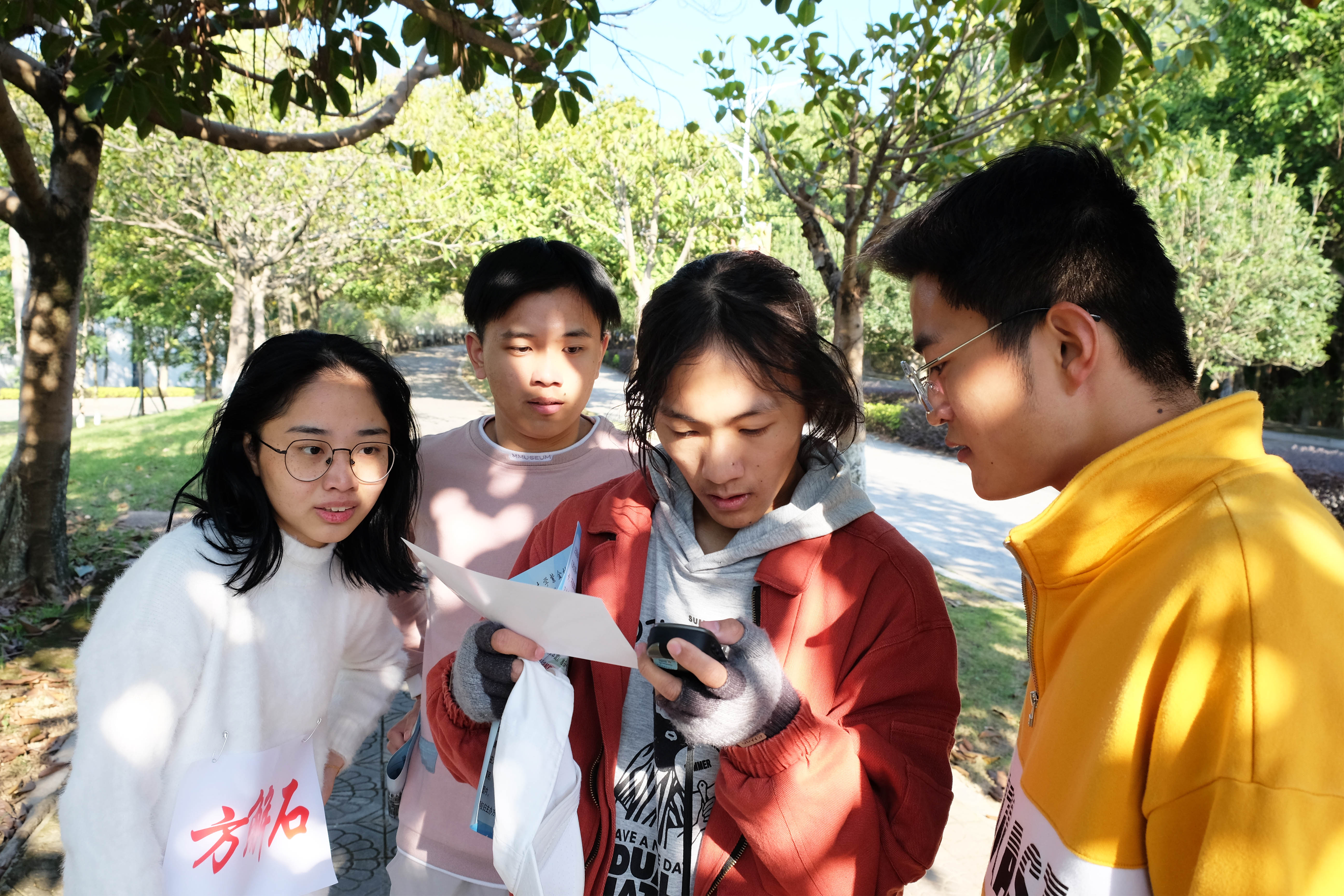 定向越野过程中,参赛队员们不借助任何交通工具,在GPS定位仪的引导下,全程跑步到达福大校园的各个角落,并根据题卡回答党史党情、校情校史、地学常识等方面的问题,是对同学们的知识储备、毅力耐力以及身体素质的综合考验。此外,参赛队伍还共同完成了“风火轮”、“蒙眼指挥官”以及“默契拍照”三个趣味游戏,展现出良好的团队协作精神和体育竞技精神。