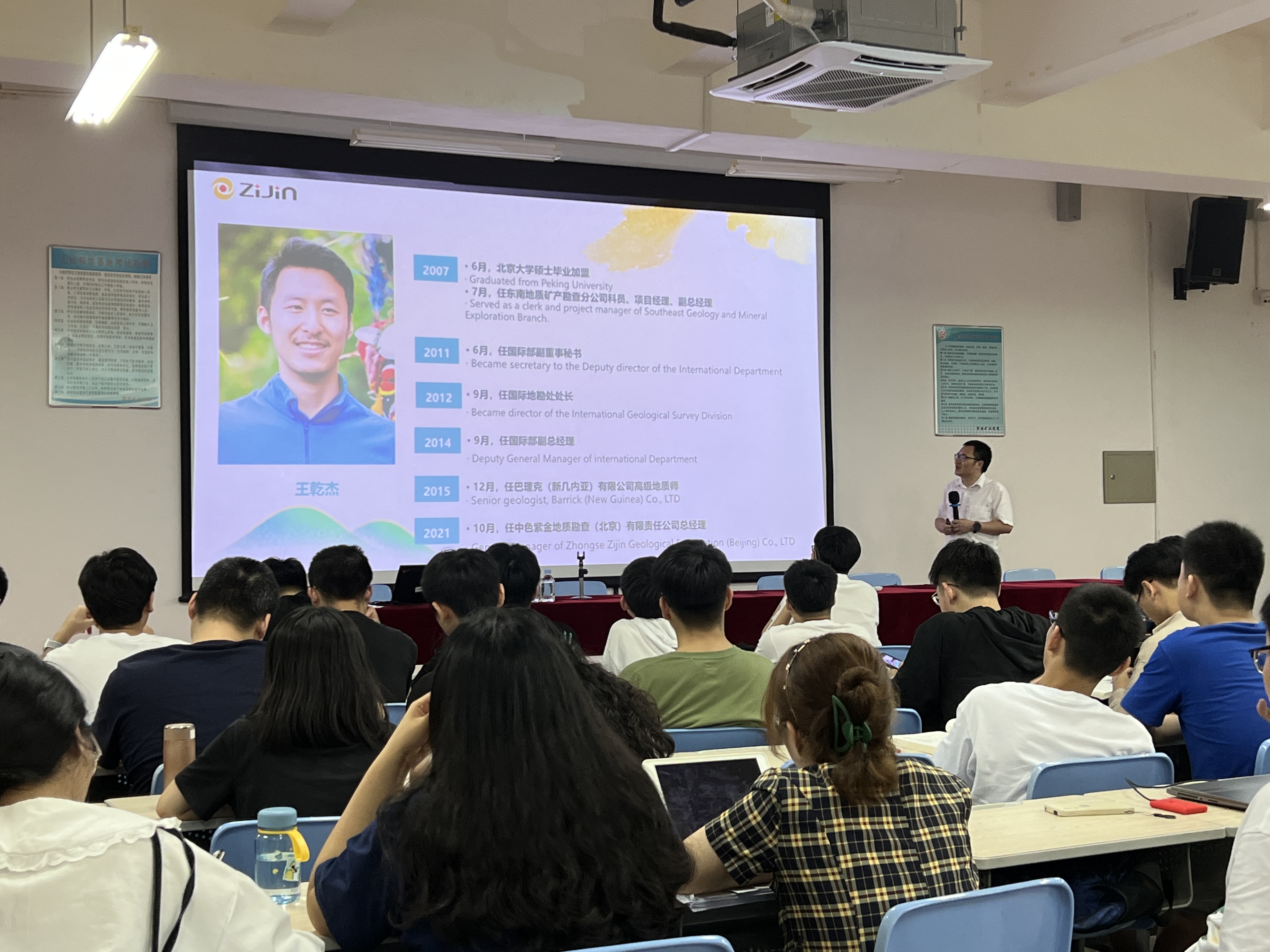 随后,黄远光总监以“丰富生命,有趣灵魂”为主题,从“浅谈矿业”、“紫金概况”等多个角度,详细介绍了紫金矿业集团公司的人才战略、人才发展情况以及预就业的相关内容。黄总监首先从矿业发展的变化入手,指出“21世纪的矿业是资金紧密型与技术密集型相结合的行业”,并通过“美国西部开发是以旧金山金矿开发为起点”这一矿业史上的经典案例,强调了矿业在当今世界主流发达国家发展史上的重要地位。接下来,黄总监还展示了王乾杰、张逸铖、马久婷等紫金集团优秀员工的工作经历,详细分析他们在紫金的发展历程。此外,黄总监还结合多组照片,讲述了自己在世界各地及知名院校的工作、招聘经历,分享自己的人生感悟,为同学们之后的人生道路指明了方向。在现场提问环节,2019级资源勘查工程2班的周淏天同学就企业的人才需求、薪资条件等方面提出疑问,黄总监给予耐心解答,并通过分析地矿行业与互联网行业的差异,强调了紫金矿业集团在员工权益保障方面的优势。