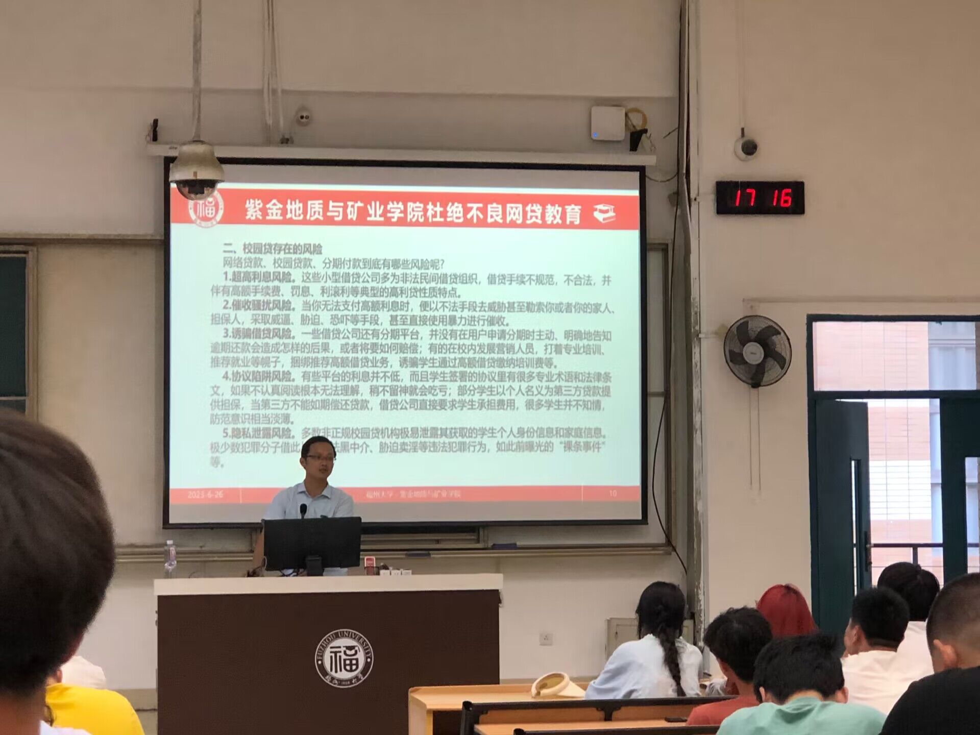 随后,辅导员谢老师对本学期工作进行了总结回顾,突出强调了违规电器、寝室卫生、出行安全、信息安全、电信诈骗、不良网贷等问题。针对期末考试,谢老师重申了考试纪律,组织大家在诚信考试承诺书上签字,并强调要抓紧时间查缺补漏、认真备考,同时也建议大家合理安排期末复习时间,适当与及时纾解压力,减少焦虑情绪,预祝大家取得理想的成绩。