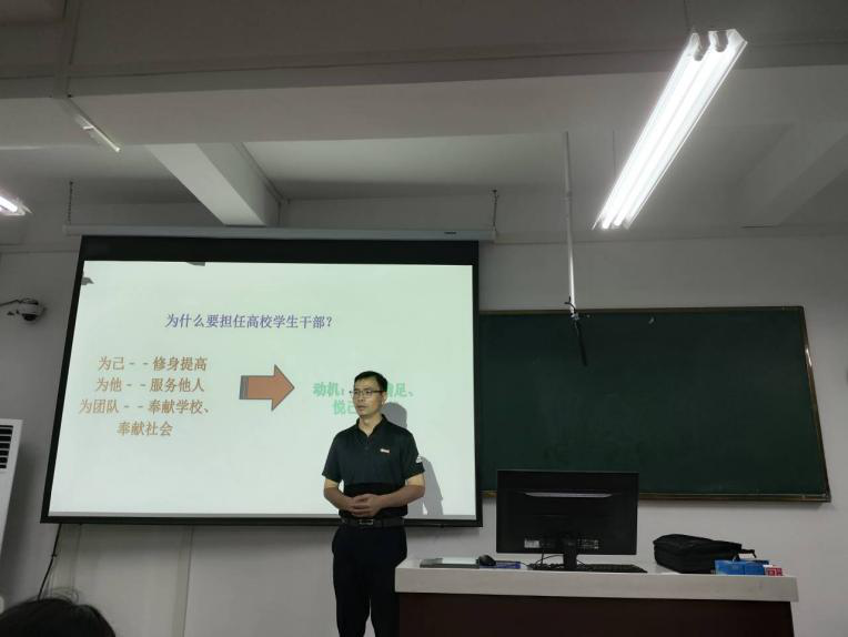 最后张老师结合实际工作,向大家介绍了如何处理大学生活中的几种关系:人际关系(学生干部与老师的关系,学生干部与同学的关系;学生干部之间的关系)、学习与工作的关系、得与失的关系。要求班干部要有牺牲担当精神,树立服务意识、责任意识、团队意识、创新意识、安全意识。