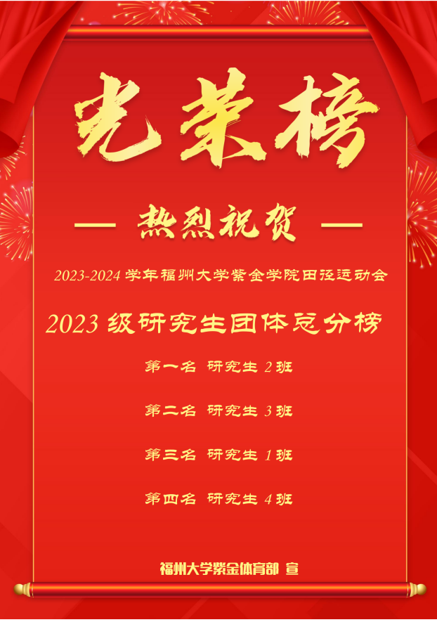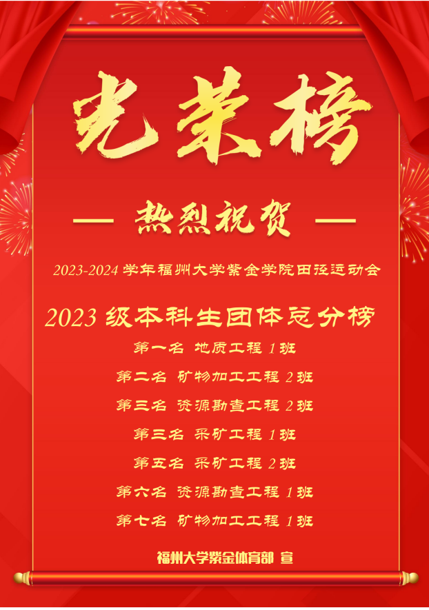 比赛现场,每位运动员都全力以赴,场外观众也热情十足,为运动员们加油助威,现场赛况紧张而精彩。最终,2023级本科生地质工程一班和研究生2班在本班同学的不懈努力与团结协作下,分别取得了2023-2024学年成人影视 紫金学院田径运动会团体总分第一名的好成绩,运动员们也在个人项目中取得优异的成绩。