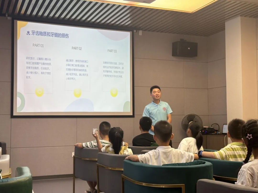 糖果是胜利者的奖品。随后,实践队成员陈立铭上台,为那些刚刚品尝过甜蜜零食奖励的孩子们带来了关于预防蛀牙的知识讲座。这简直是“钓鱼执法”,他通过生动的例子,向孩子们阐述了维护牙齿健康的必要性,从而巧妙地将科普知识与儿童的日常生活实际相结合。