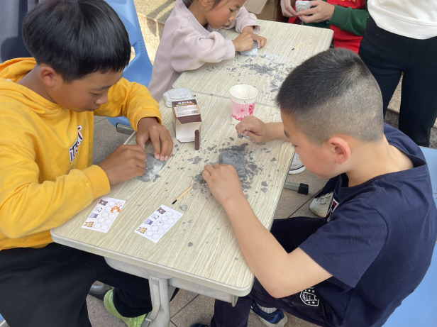 本次活动还设置了趣味实践环节,包含“考古挖掘”“DIY涂色”“手串制作”“巧取乒乓”四大主题游戏。孩子们在动手实践中感受乐趣,也在互动中与志愿者大朋友拉近距离。