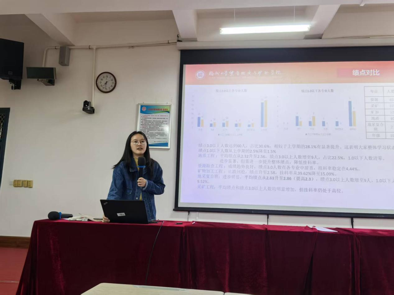 2022级辅导员丘靖老师通过详实的数据,对比分析了各专业2024-2025学年第一学期与2023-2024学年第二学期表现,以及绩点、挂科率、首考通过率的变化,从总体而言,2022级学业情况持续向好,学业综合水平不断提升,但年级学业预警情况也需要引起重视。接着,由副书记张志雄、副院长胡建华为学业进步突出的同学颁发奖状。